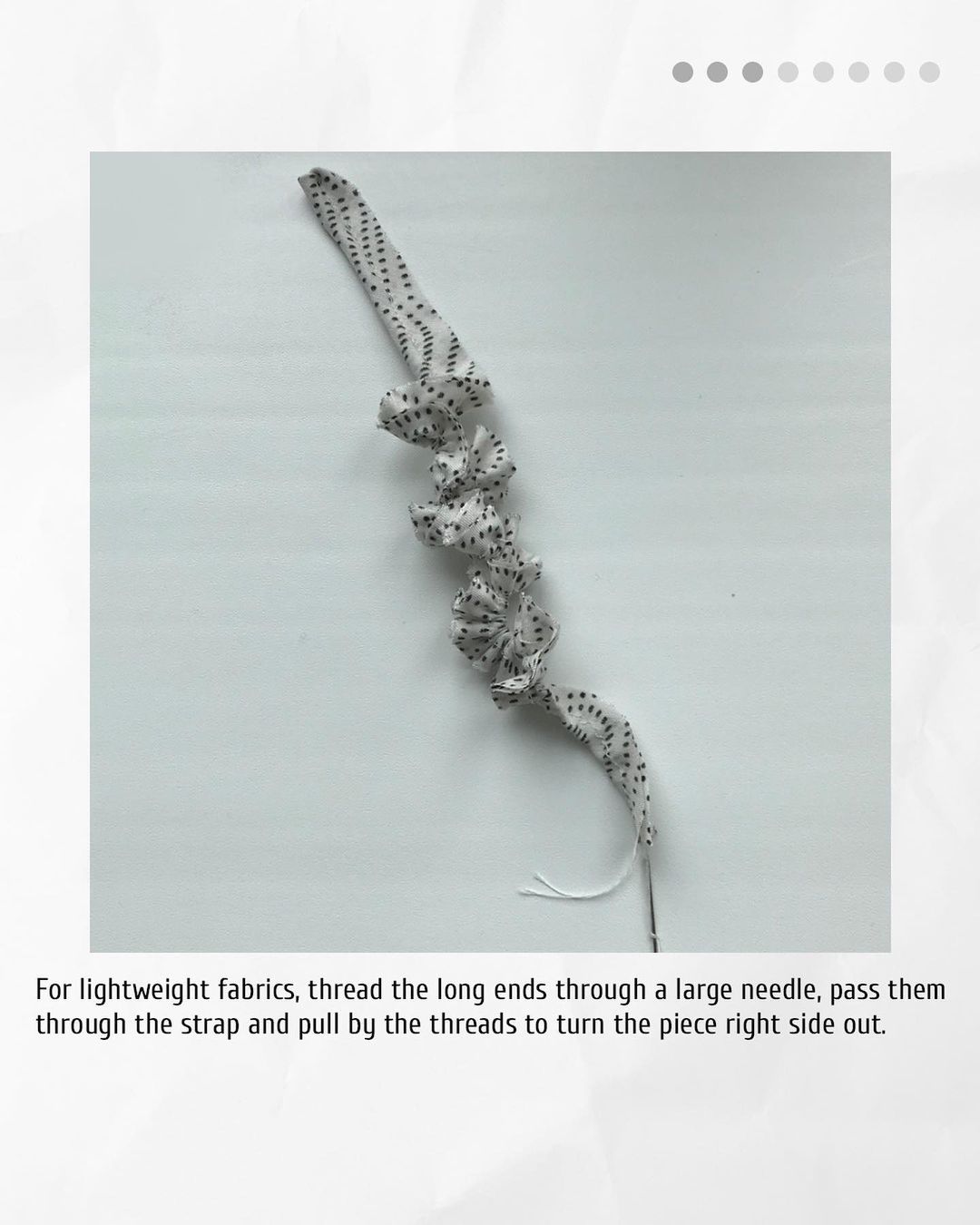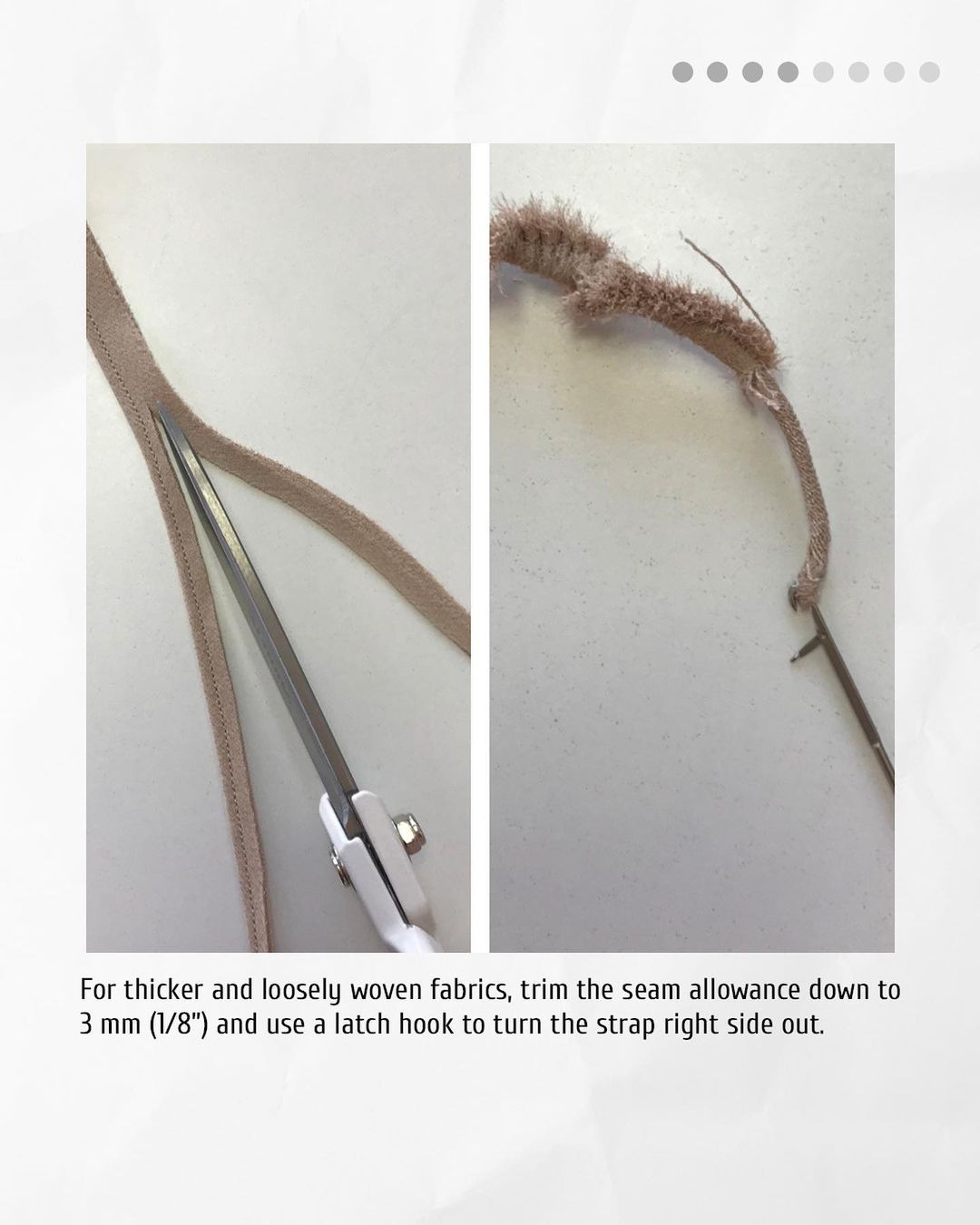 3️. For lightweight fabrics, thread the long ends through a large needle, pass them through the strap and pull by the threads to turn the piece right side out. For thicker and loosely woven fabrics, trim the seam allowance down to 3 mm (1/8”) and use a latch hook to turn the strap right side out.