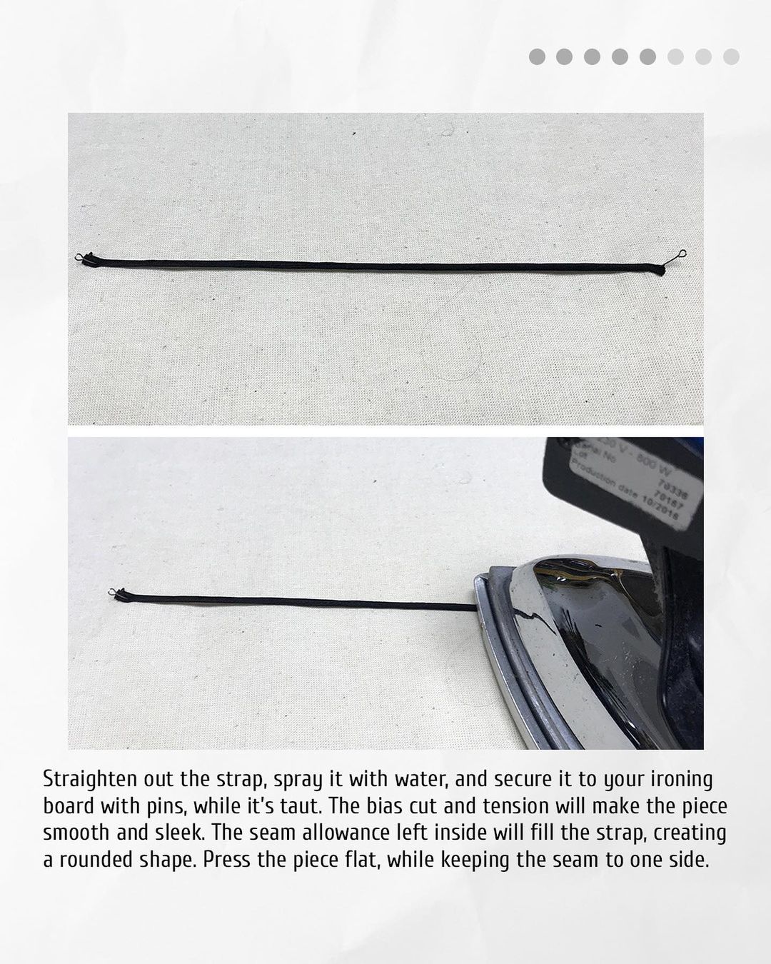 4️. Straighten out the strap, spray it with water, and secure it to your ironing board with pins, while it’s taut. The bias cut and tension will make the piece smooth and sleek. The seam allowance left inside will fill the strap, creating a rounded shape. Press the piece flat, while keeping the seam to one side.