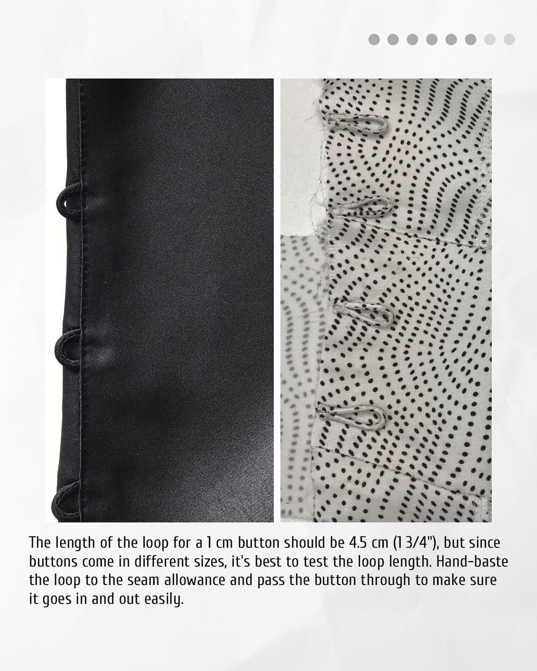 5️. The length of the loop for a 1 cm button should be 4.5 cm (1 3/4"), but since buttons come in different sizes, it's best to test the loop length. Hand-baste the loop to the seam allowance and pass the button through to make sure it goes in and out easily.