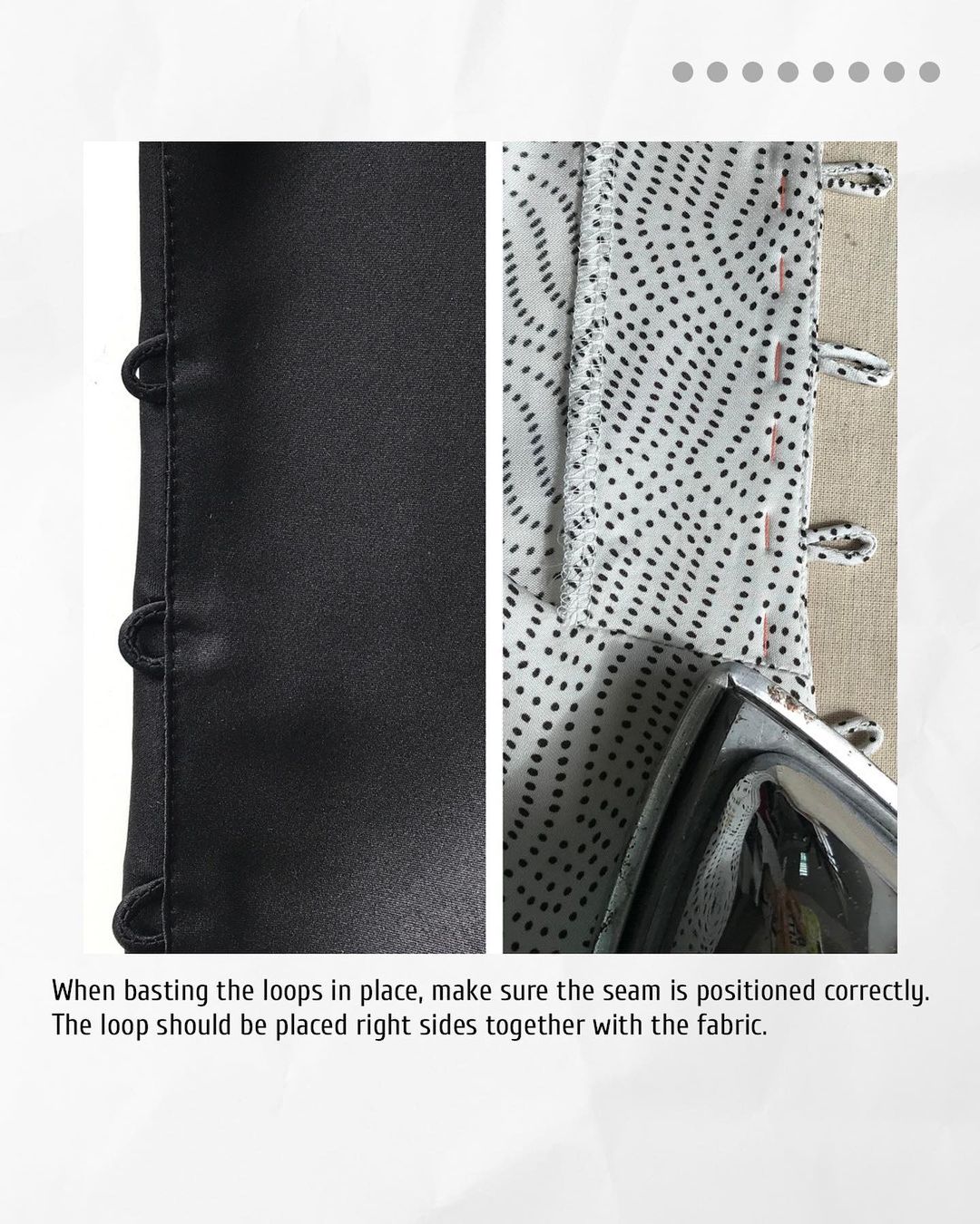 7️. When basting the loops in place, make sure the seam is positioned correctly. The loop should be placed right sides together with the fabric.