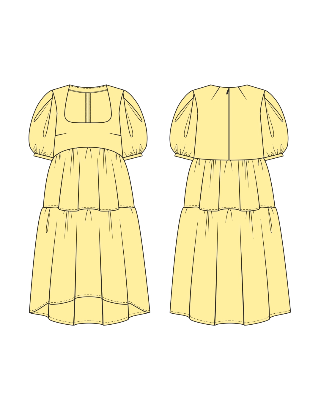 Swipe to see the technical drawings. We removed the princess seams, added bust darts, removed the waist darts, added an empire waist seam, and added flared tiers.