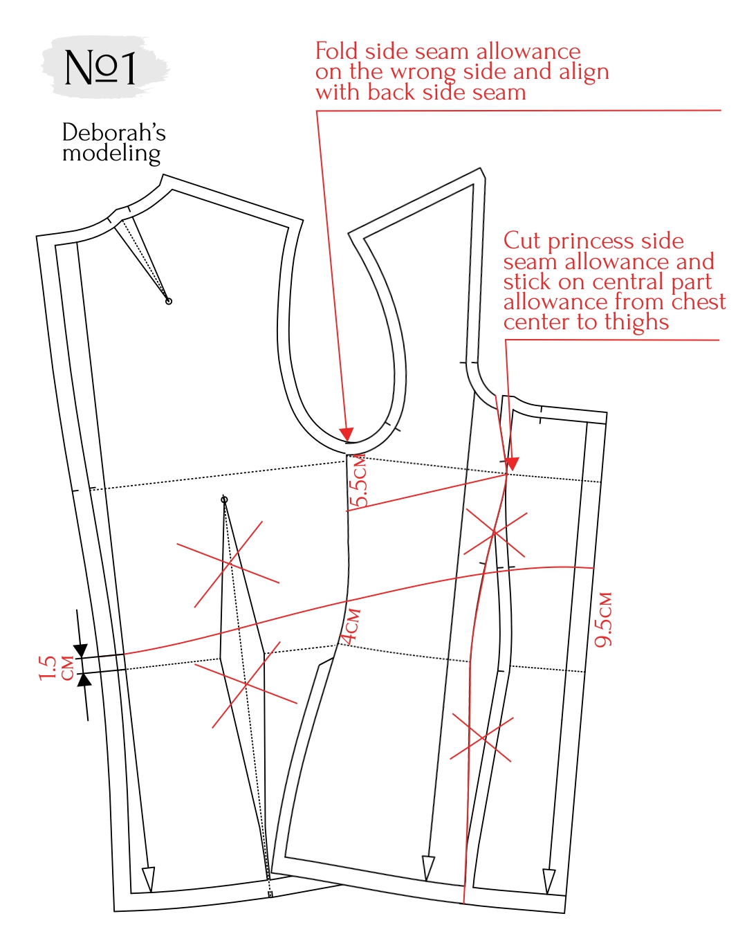 - measure 1 cm down from the center bust notch on the princess seam. Connect these points with a straight line from the side seam to the princess seam and cut along this line.