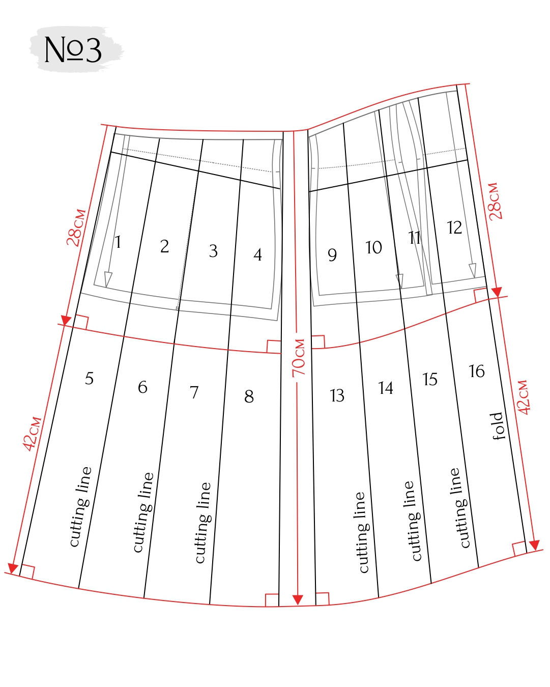 First, secure the lower front section on paper (you may tape printer paper sheets together). The length of the piece must be 70cm along the entire width (from side seam to center). The bottom corner of the side front seam will be lower than the corner of the center front hem.