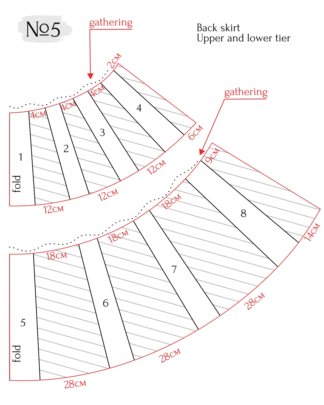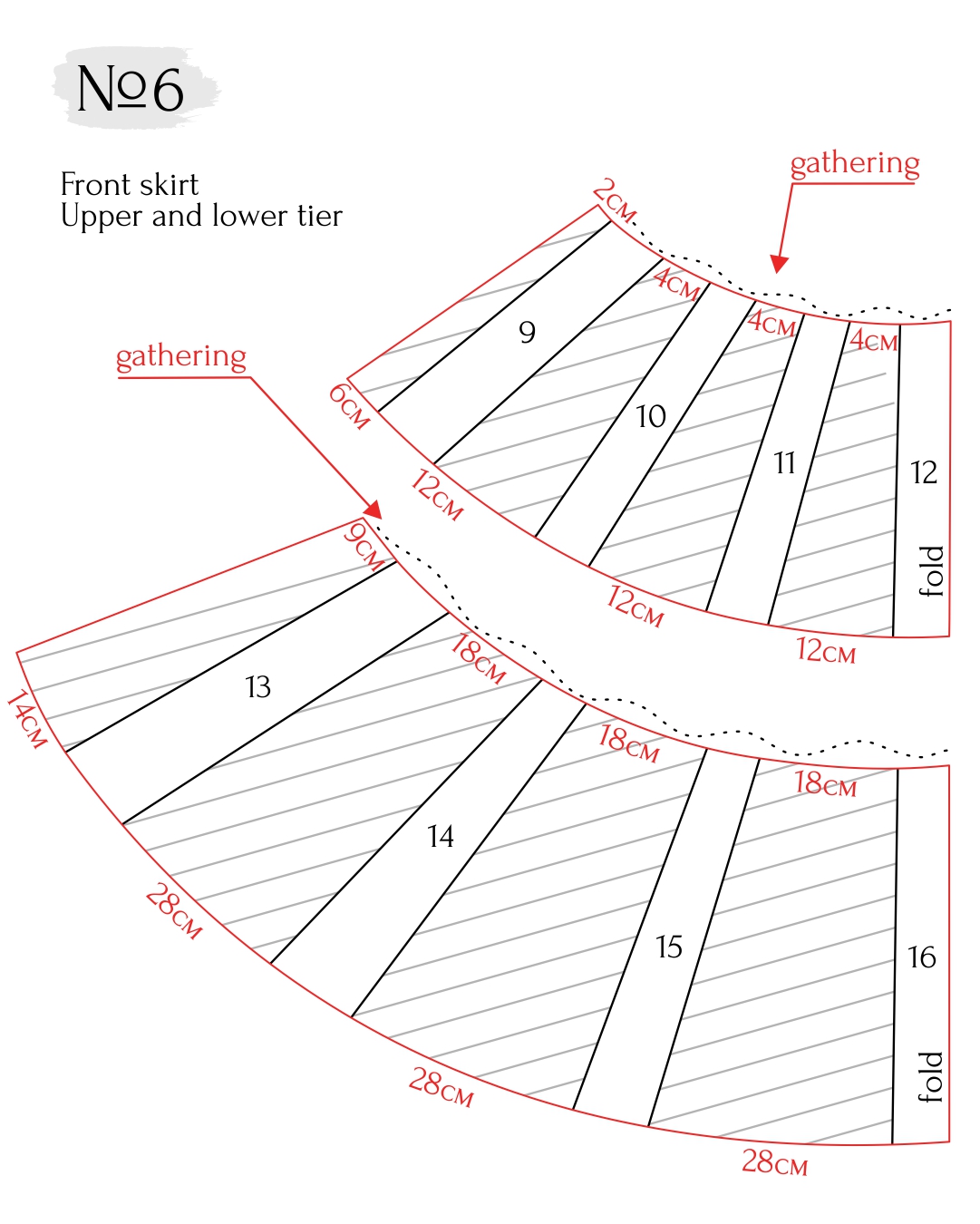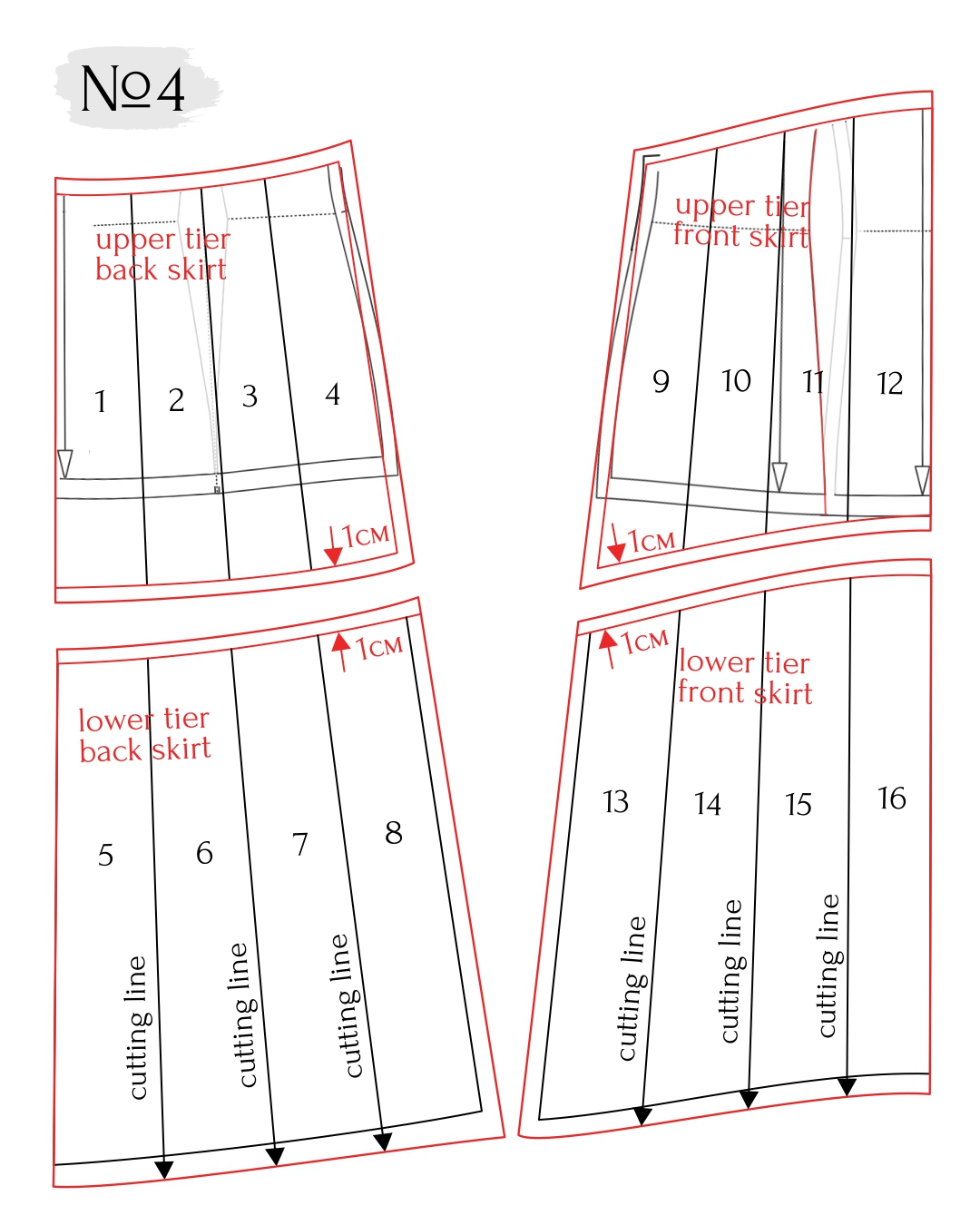 - Align the pieces along the side seams and check that the lines match. Cut the pieces along the tier line and add seam allowances to the cut edges.