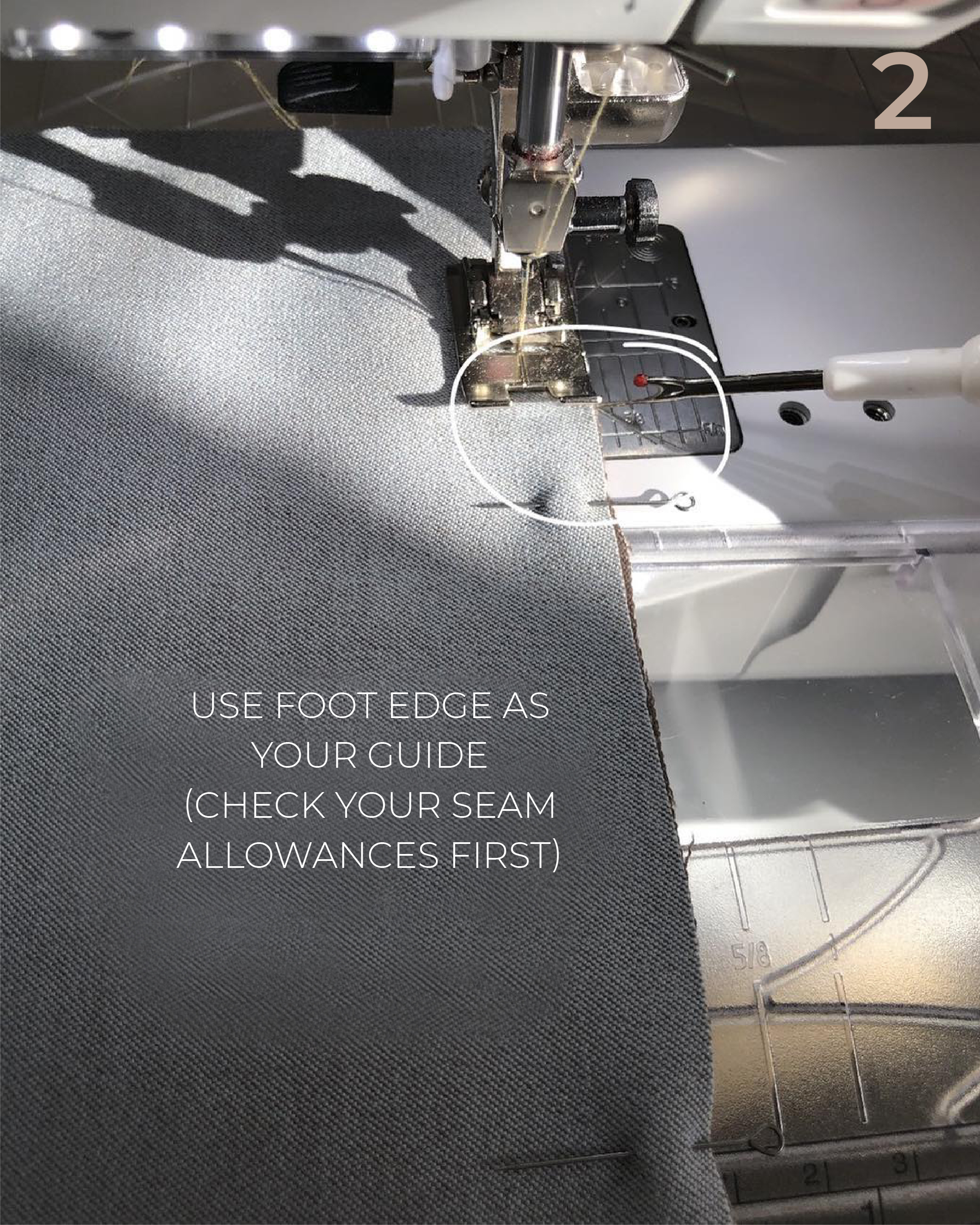 - Use the presser foot edge as a guide (or + 1/2mm, depending on your foot width). Place the needle to the far left. Do not look at the needle — look at the foot’s edge.