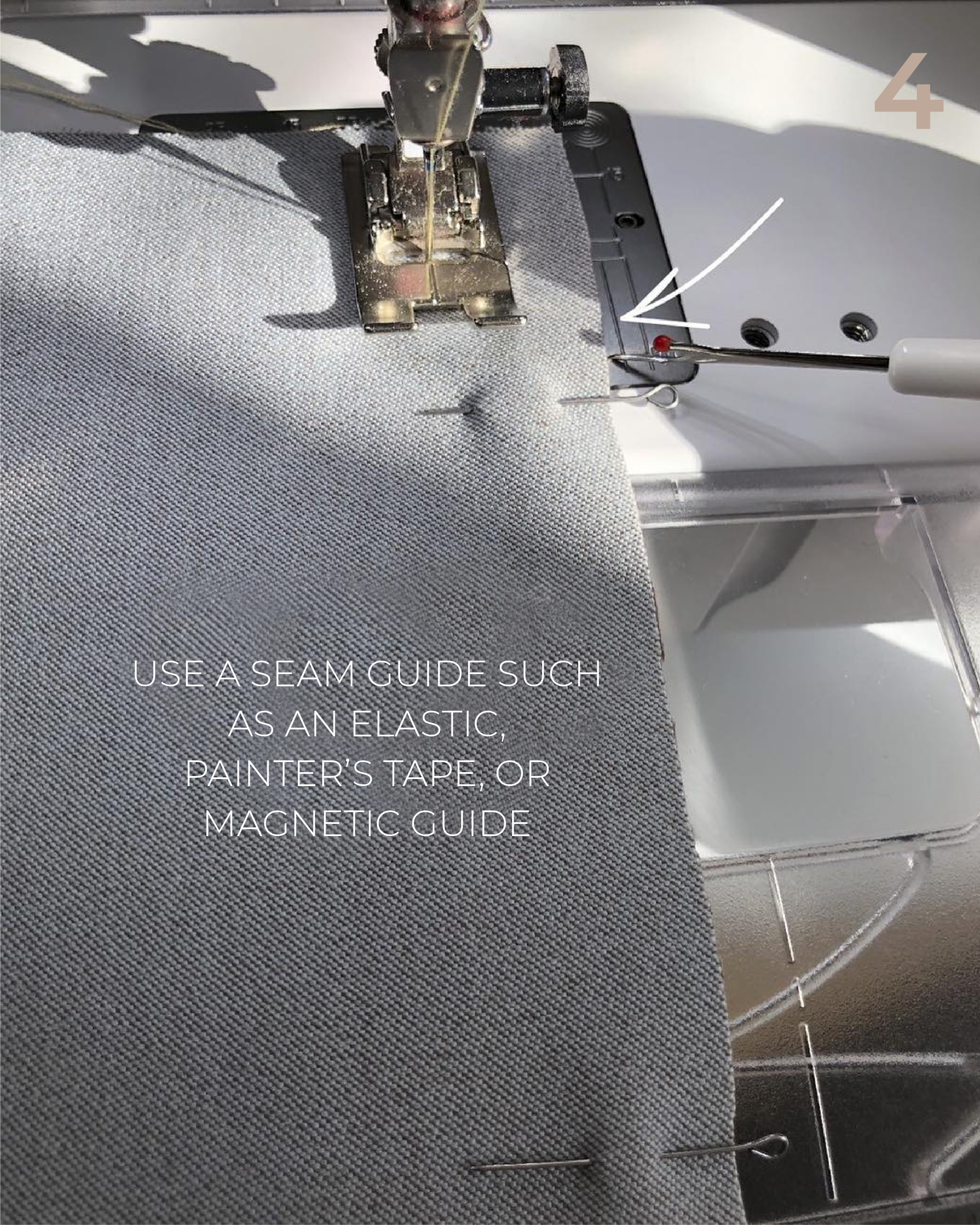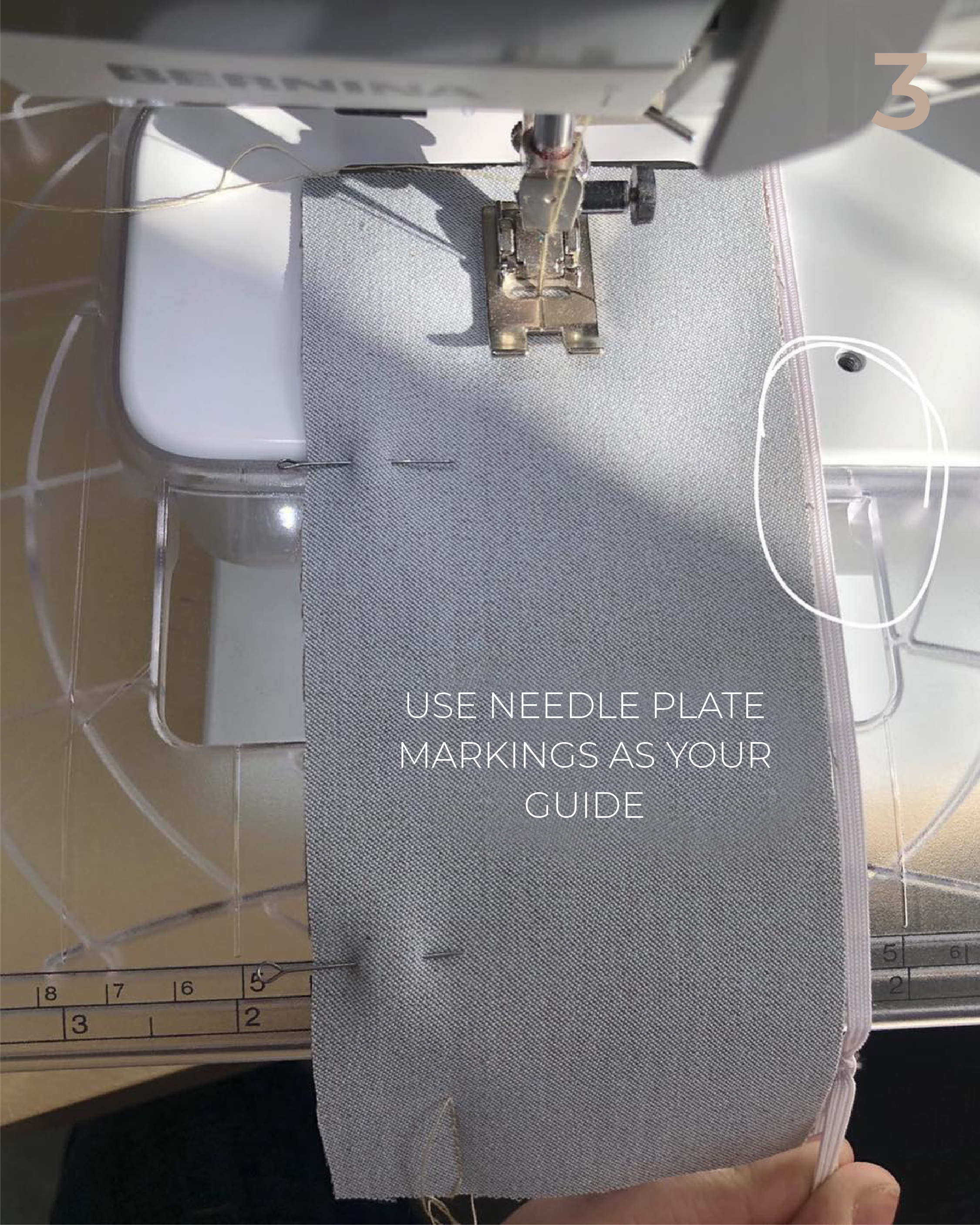 - Look at the markings on the needle plate. Or alternatively make a mark on the plate with painter’s tape, elastic, or rectangular magnet. Place your fabric against the mark and use it as your guide.