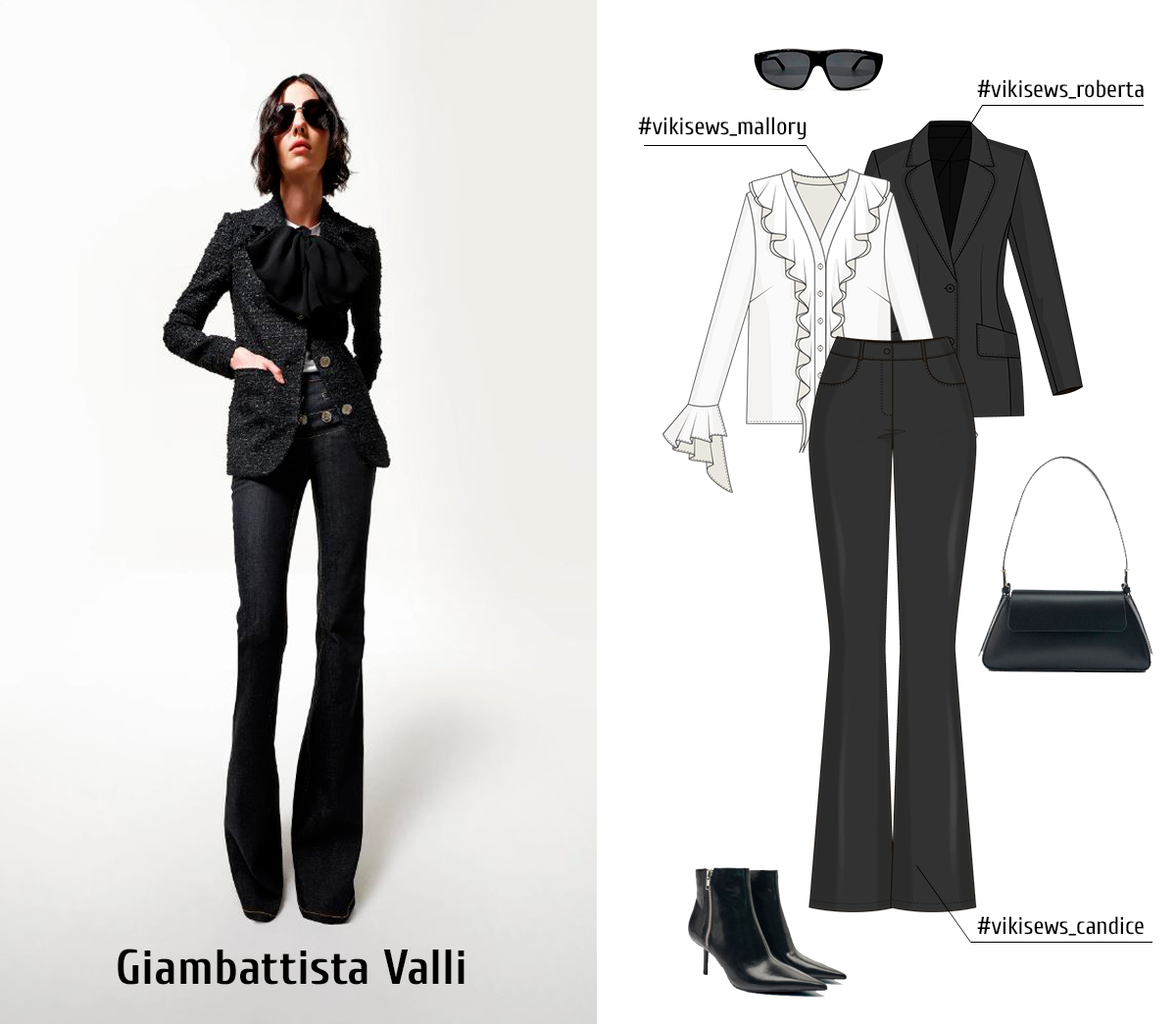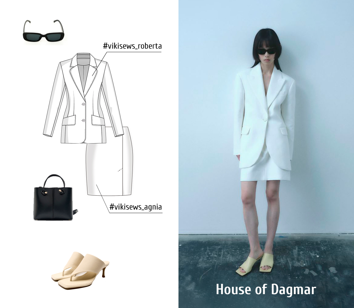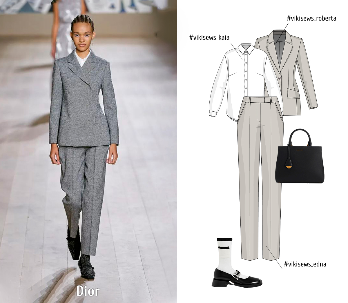 Dior makes stunning, elegant, feminine clothes. You can create a Dior-inspired outfit using Vikisews patterns of Roberta blazer, Edna trousers, and Kaia blouse.