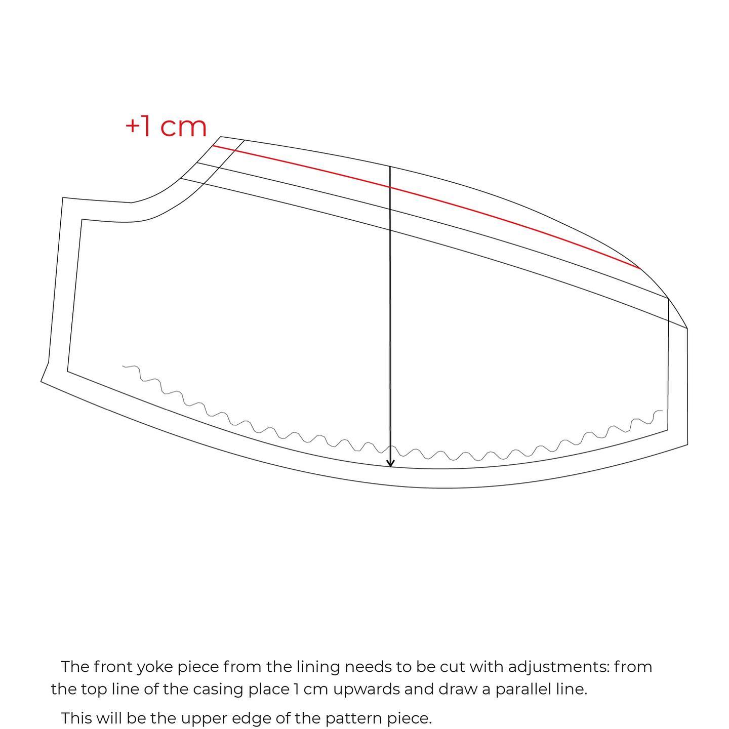- The front yoke piece from the lining needs to be cut with adjustments: from the top line of the casing place 1 cm upwards and draw a parallel line. This will be the upper edge of the pattern piece. During assembly place the front yoke lining facing side on the wrong side of the front yoke of the main fabric. Attach along the upper line of the casing, trim the seam allowance to 5 mm. Then fold back the front yoke lining piece onto the front yoke and lay the stitching all the way along the bottom line of the casing. So the front of the casing will be made from the front-facing lining piece. (Diagram 1)