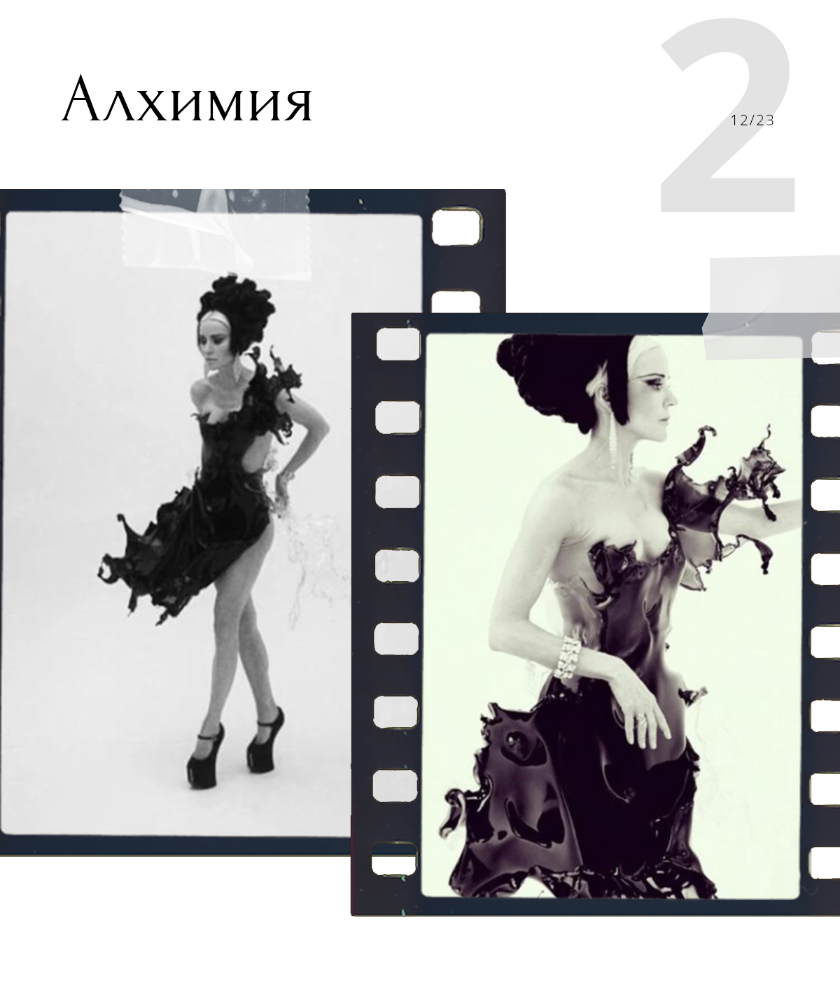 Айрис — настоящий алхимик в мире моды. Почему? Посмотрите на ее творения. Например, платье, которое напоминает брызги черной туши и воды. Материал — акрил. Он похож на органическое стекло.
