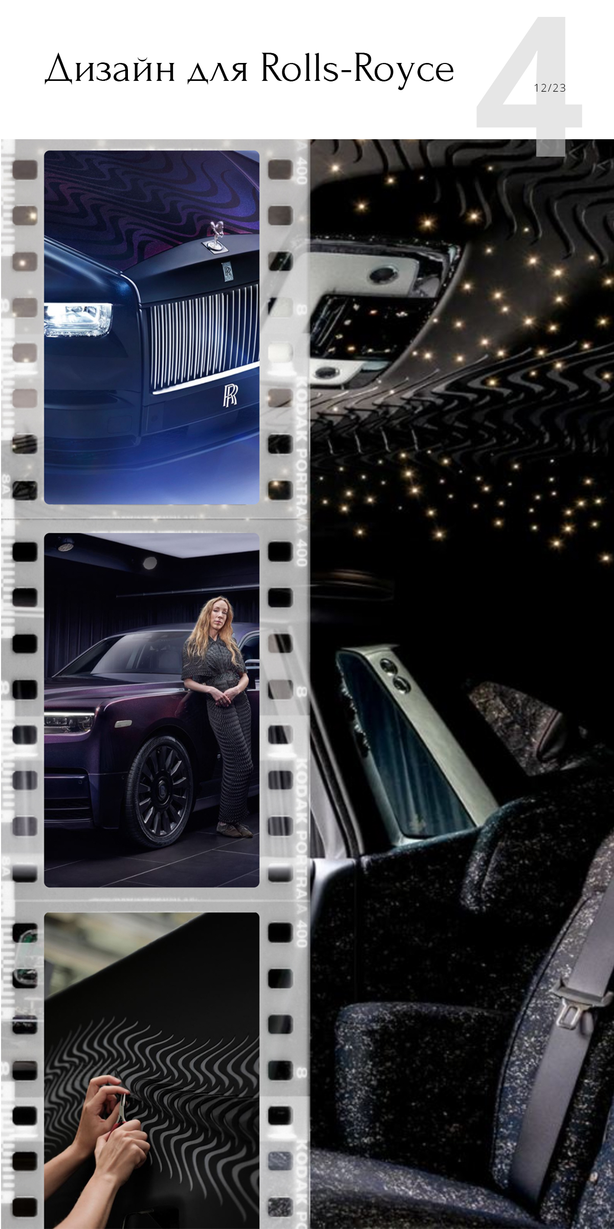 Айрис интересуется не только одеждой. Она разрабатывала дизайн автомобиля Rolls-Royce — обновленной модели Phantom Syntopia. Ее отличает работа с текстилем — обивка потолка, напоминающая звездное небо, объемный декор, шелковые сиденья и подкладка из стеганой ткани. По словам ван Херпен, ее вдохновила текучесть и плавность воды, движение которой хотелось передать. Кажется, получилось.