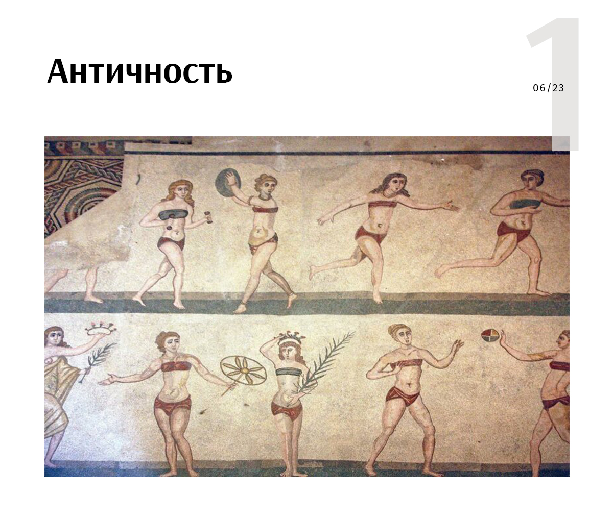 Когда в Помпеях проводили раскопки, нашли статую Венеры в наряде, похожем на купальник. А на одной из римских мозаик, которую выкладывали мастера примерно в III-IV веках, изображены красивые римские спортсменки в одеждах, похожих на бикини.