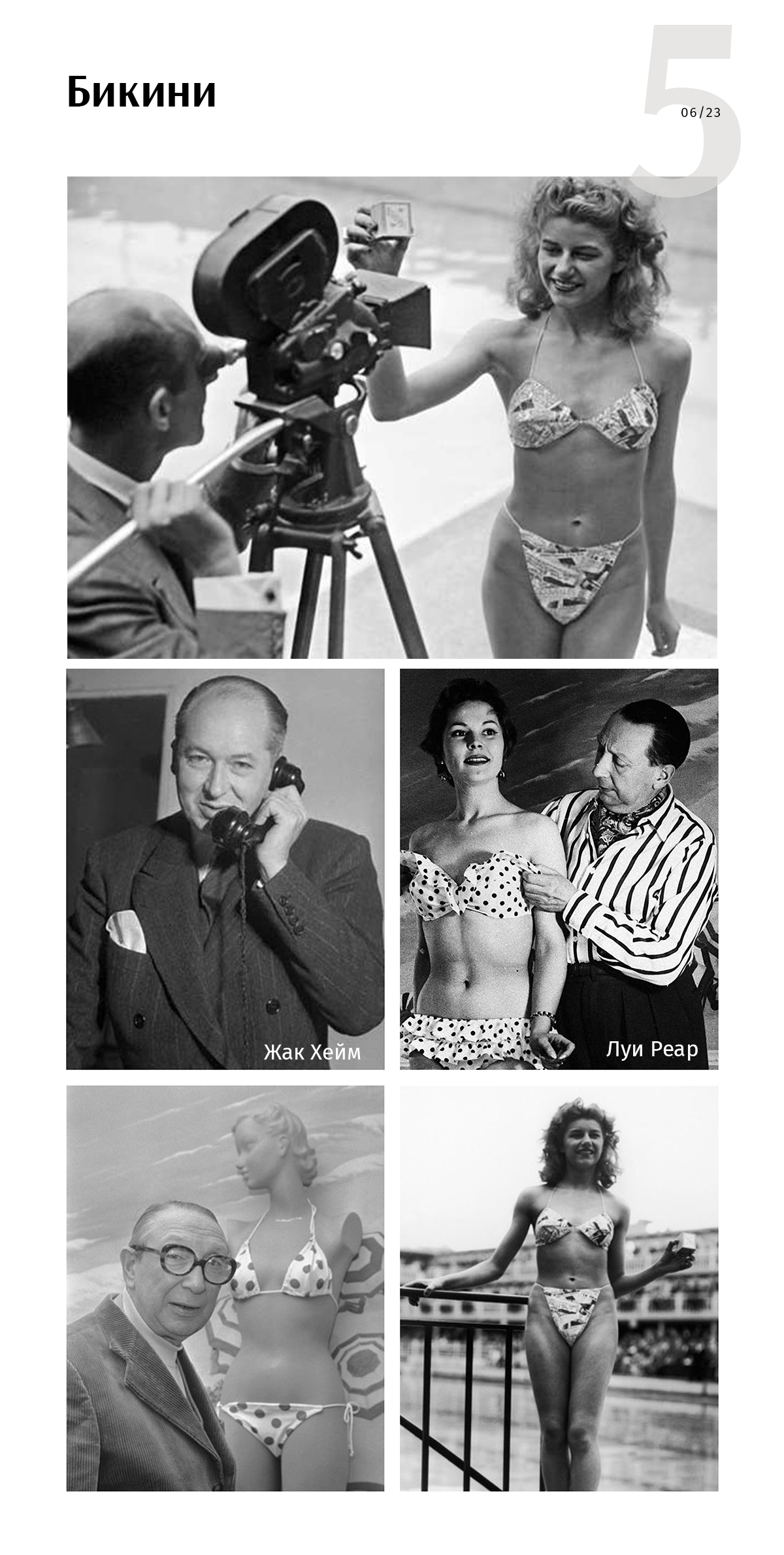 В том же 1946 году, 5 июля Луи Реар предложил свой вариант купальника — «Бикини», который состоял из трех треугольников и шести ниточек. По замыслу дизайнера, такая модель должна была произвести эффект разорвавшейся бомбы, поэтому и имя не случайно. Бикини — название атолла, где США проводили ядерные испытания.