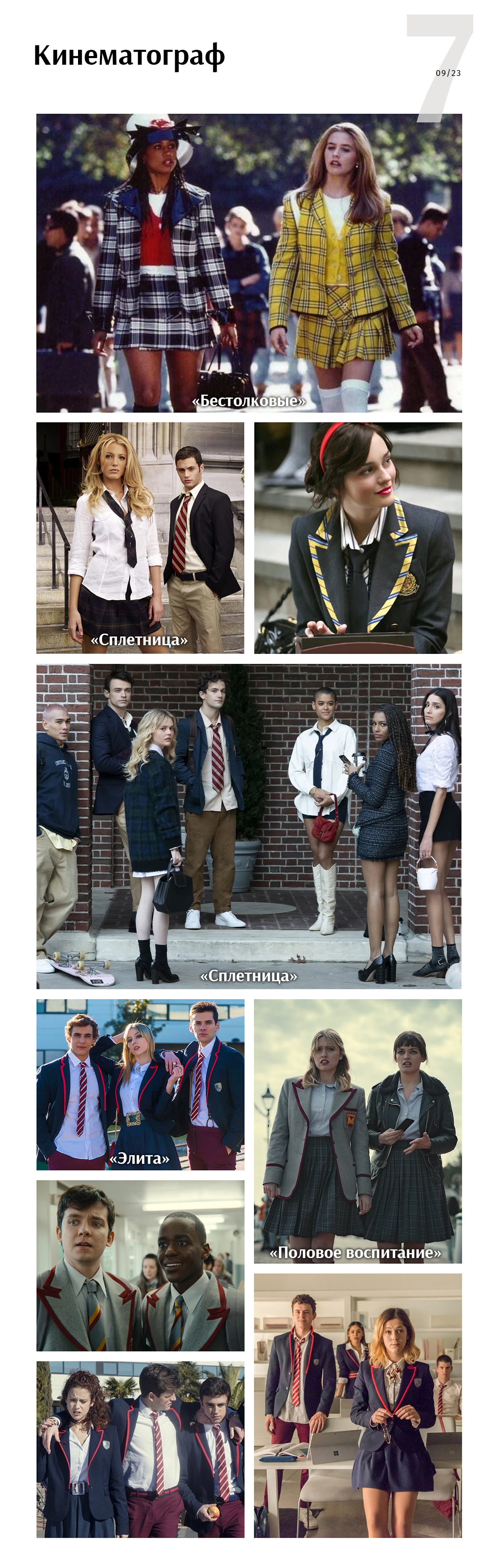 Конечно, свою роль в неиссякаемом интересе к теме школьного стиля сыграл и кинематограф. Образы из уже культовых «Бестолковых», «Сплетницы» и более свежих сериалов, как «Половое воспитание» и «Элита», — это несомненные референсы многих модных выходов it-girls.