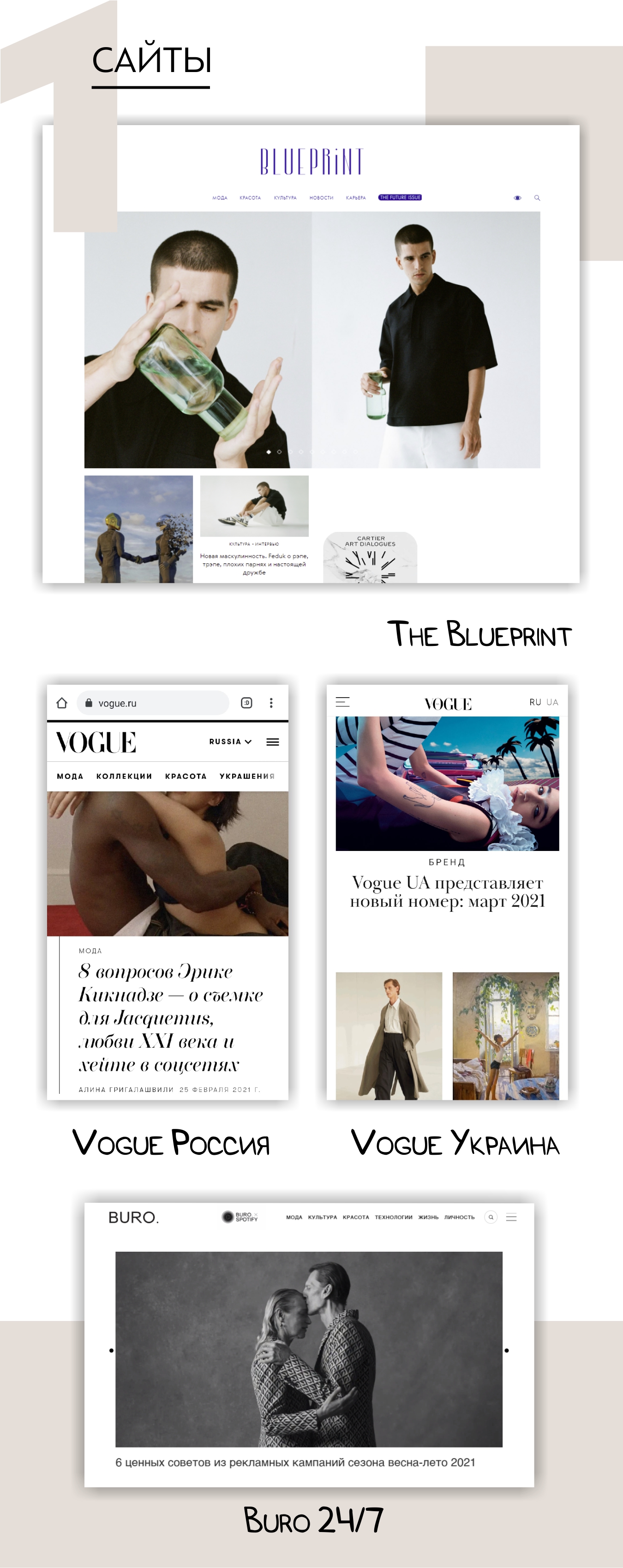 Vogue — интересно смотреть сайты одного издания в разных странах — они отличаются. На русском языке есть 2 версии: Vogue Россия и Vogue Украина. Украинская больше ориентирована на Запад.
