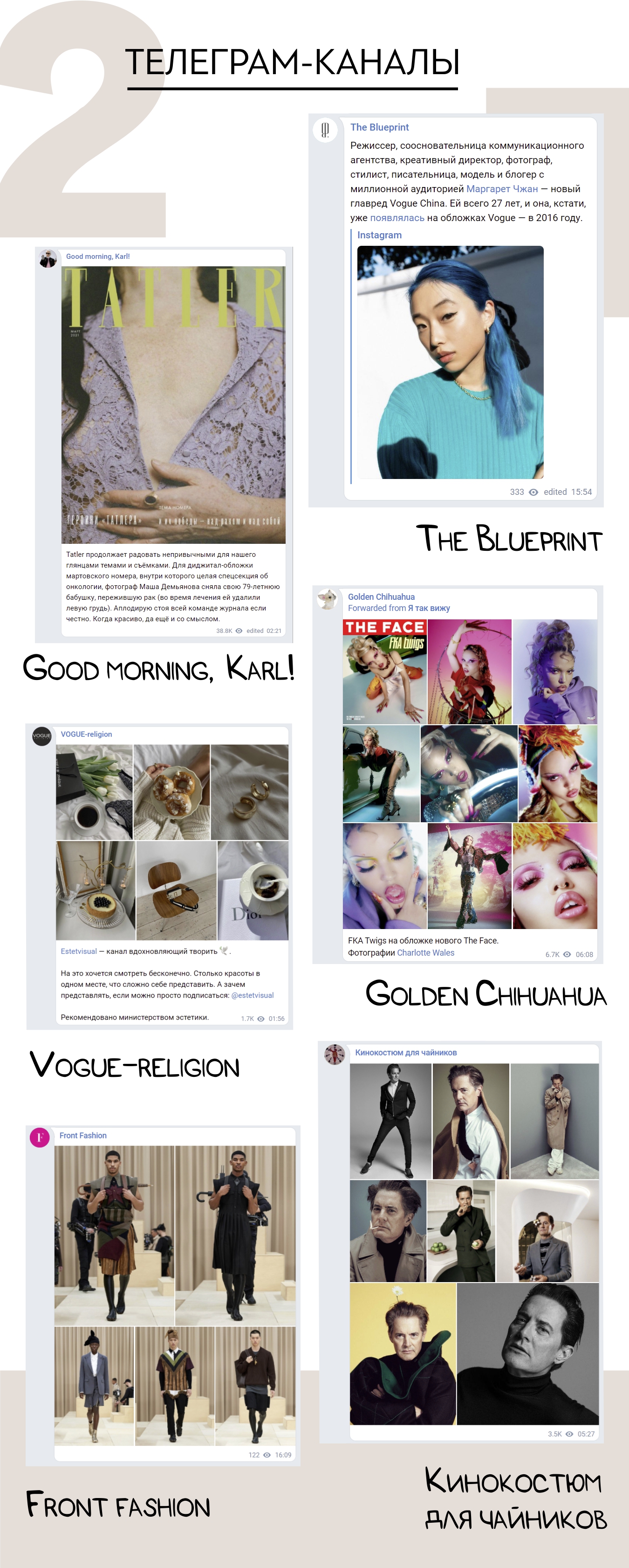 The Blueprint — здесь собрана самая актуальная информация из мира фэшн-индустрии, разборы образов, интервью и модные тренды. Если вы интересуетесь модой, то обязательно ставьте на нем закладку. Ни один тренд не пройдет мимо вас. Удобная версия в телеграме тоже есть — ссылку на него дадим ниже.