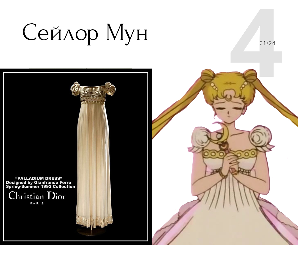 Сейлор Мун — еще один аниме-персонаж, полюбившийся моде. У него была коллаборация с Джимми Чу, которые выпустили обувь и аксессуары по мотивам мультфильма. Более того, в самой мультфраншизе герои одевались в фешен-вещички — художница черпала вдохновение у модных дизайнеров. Так, платье Серенити — это Dior из коллекции 1992 года, а кроме того, есть отсылки к работам Chanel и Saint Laurent.