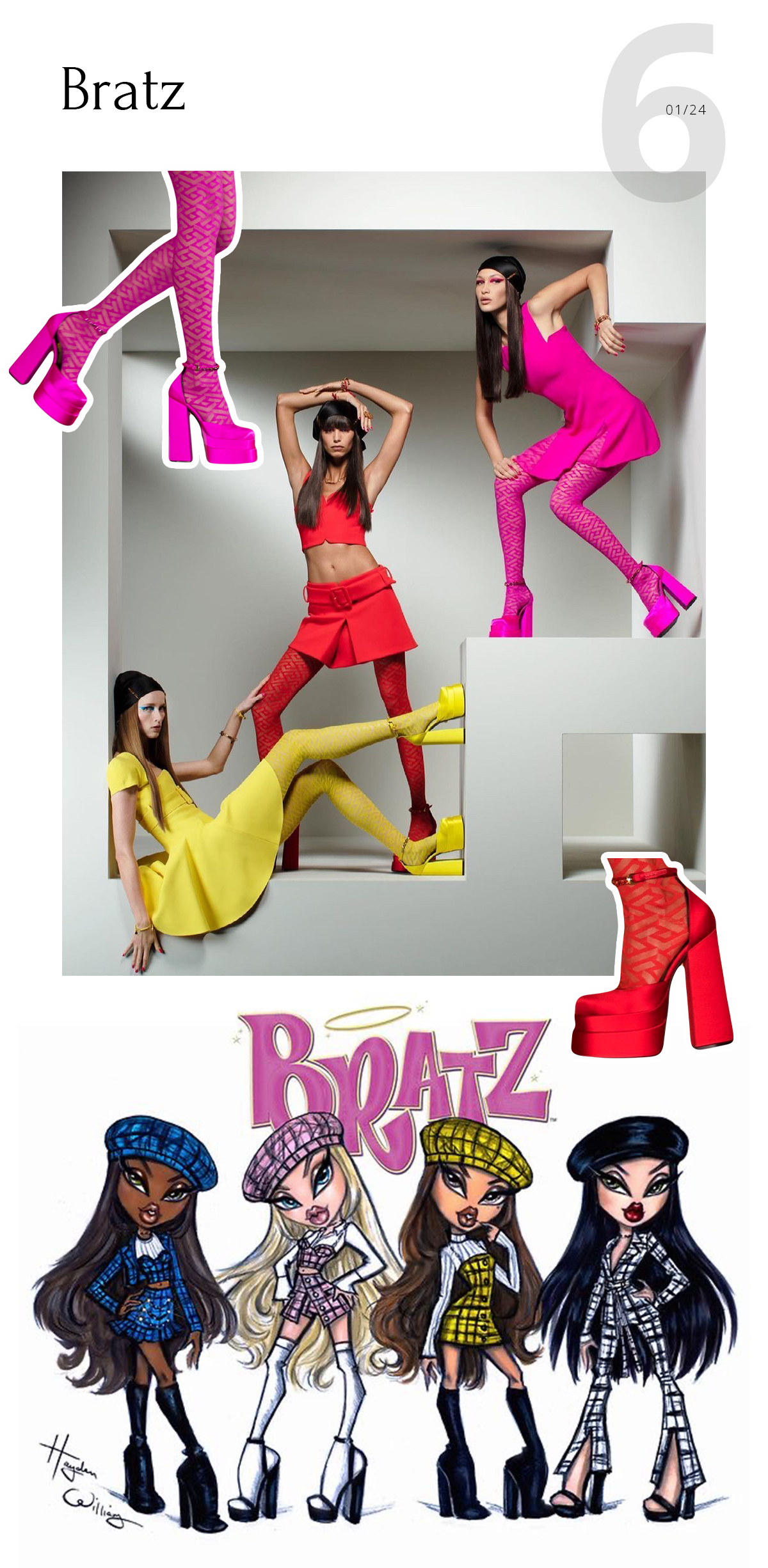 Кукольная обувь Bratz на платформе стала главным трендом прошлых сезонов. Самое интересное, что это не была коллаборация, но ассоциация оказалась настолько читаемой, что в «народе» тренд так и окрестили — туфли Братц. Многие выпускали подобные модели, но трендсеттером определенно стал Versace.