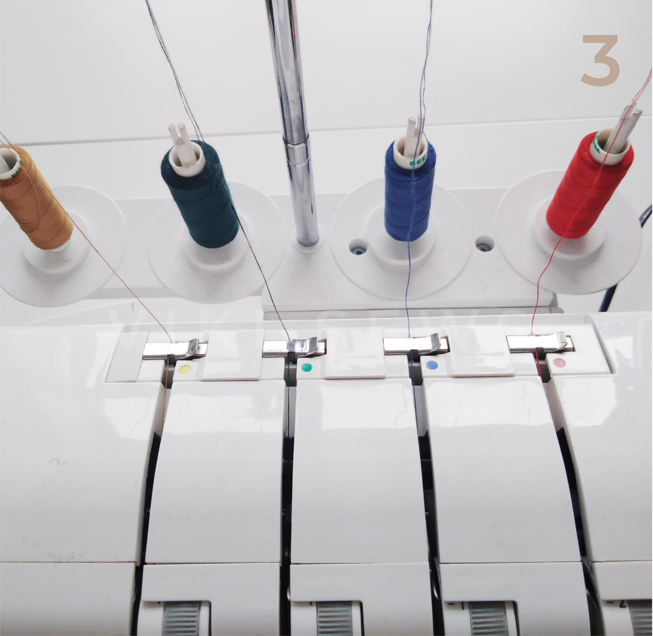 Заправьте оверлок цветными нитями, как на фото 3. Так станет очевидно, натяжение какой нити нужно ослабить, а какой — затянуть с помощью регулятора. У нас: