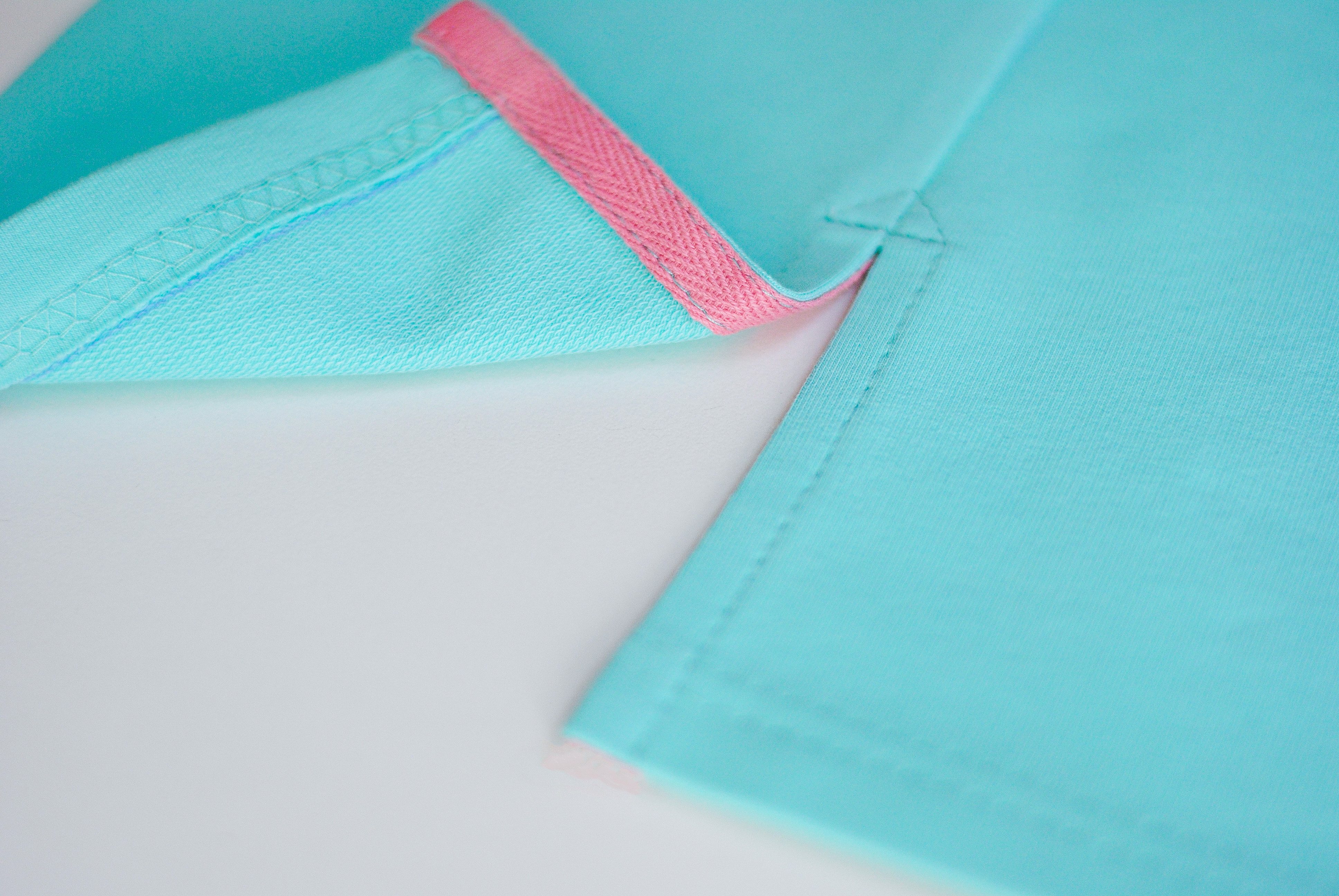 Обработка разреза киперной лентой на футболке-поло может быть простой. Мы покажем 2 варианта оформления низа изделия в районе ленты.