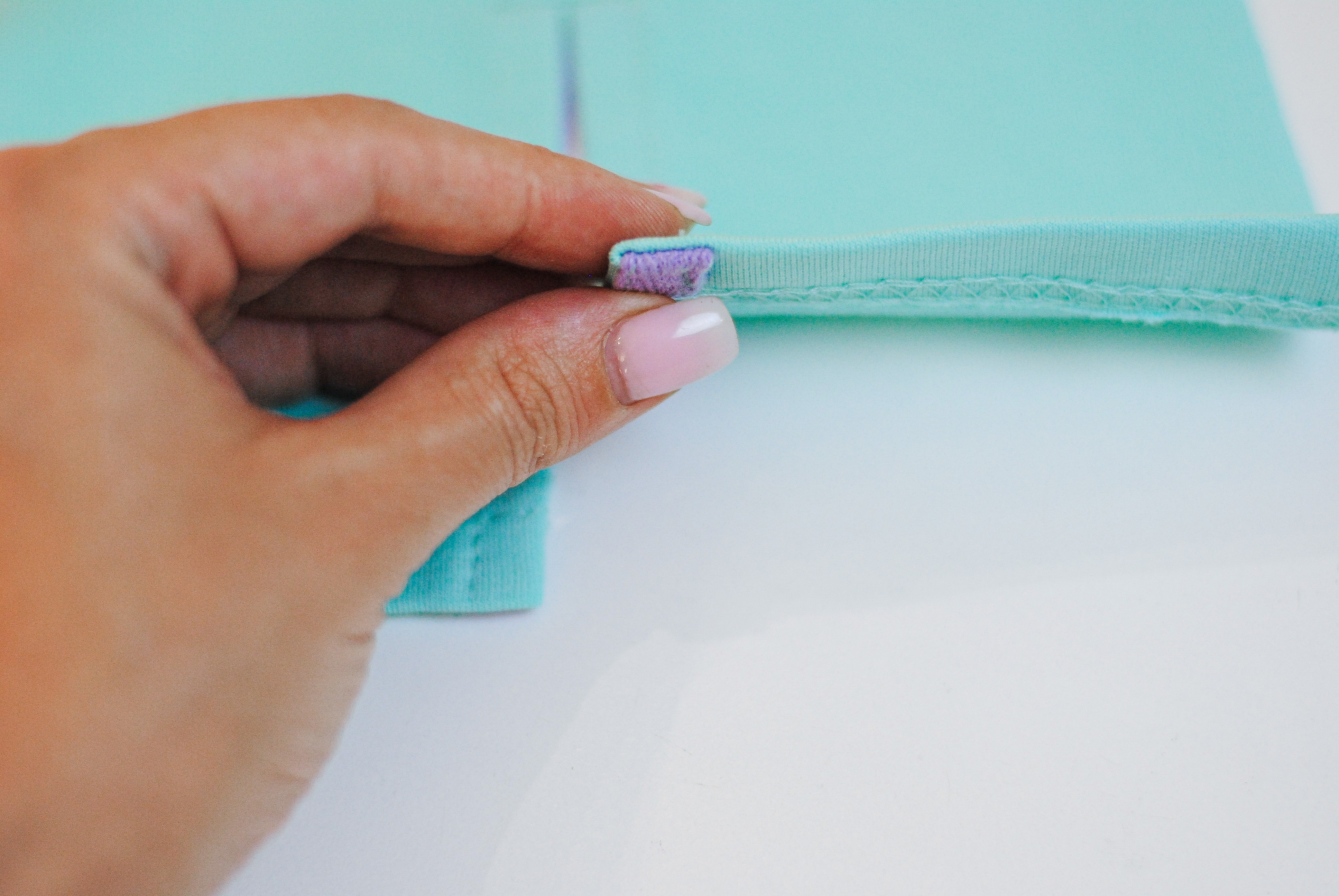 - Подогните низ изделия на изнаночную сторону на 2-2,5 см и зафиксируйте припуск на распошивальной машине или коверлоке. В этом варианте «плоский шов» заходит на киперную ленту.