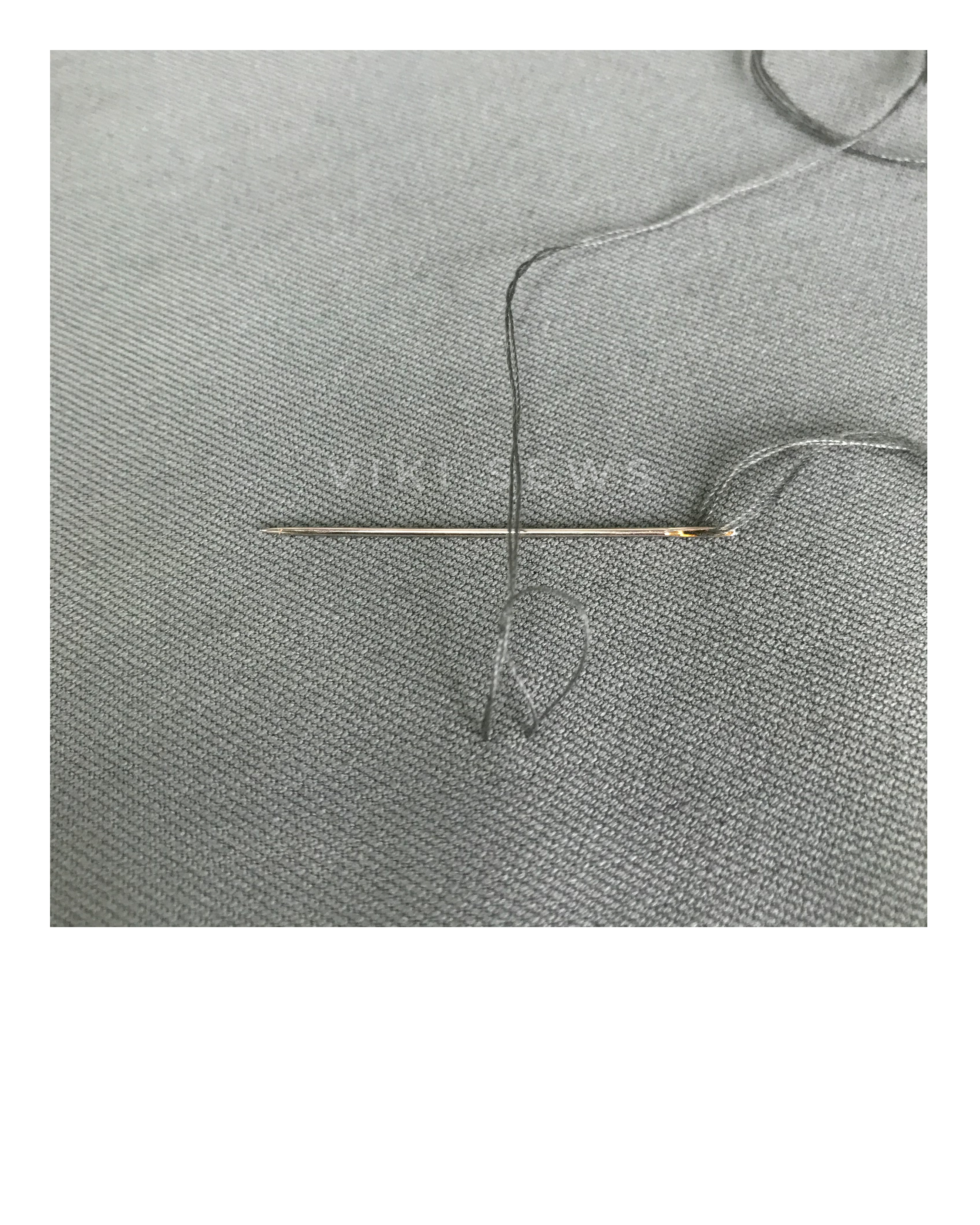 Возьмите иглу с ушком, в которое легко продеть нить в два сложения. Вставьте нитку двумя концами в ушко, а «целую» часть оставьте длинной. Сделайте прокол иглой в месте разметки так, чтобы она прошла через петлю, которая образовалась из нитей пришивания пуговицы. Так нить фиксируется без узелка.