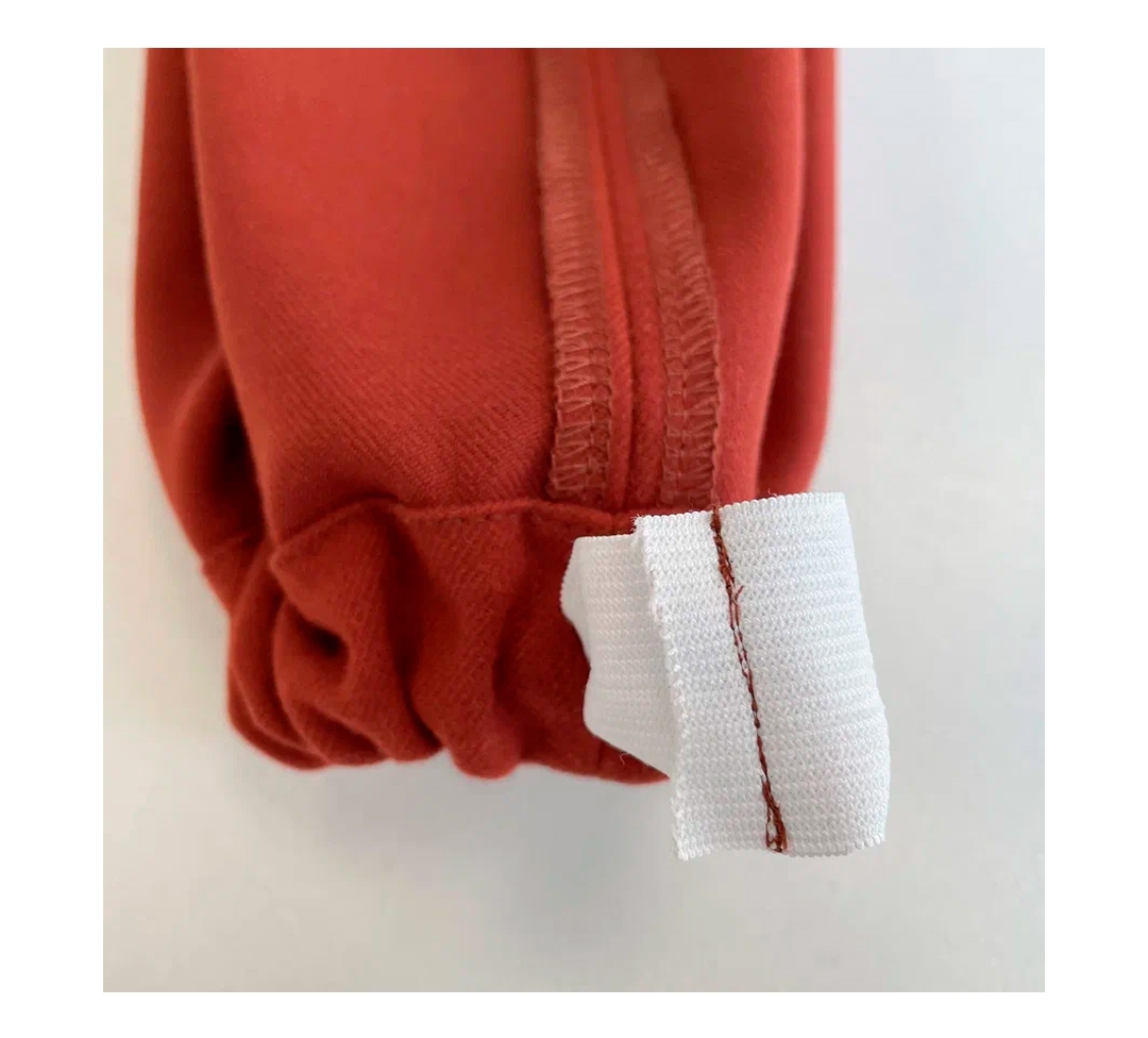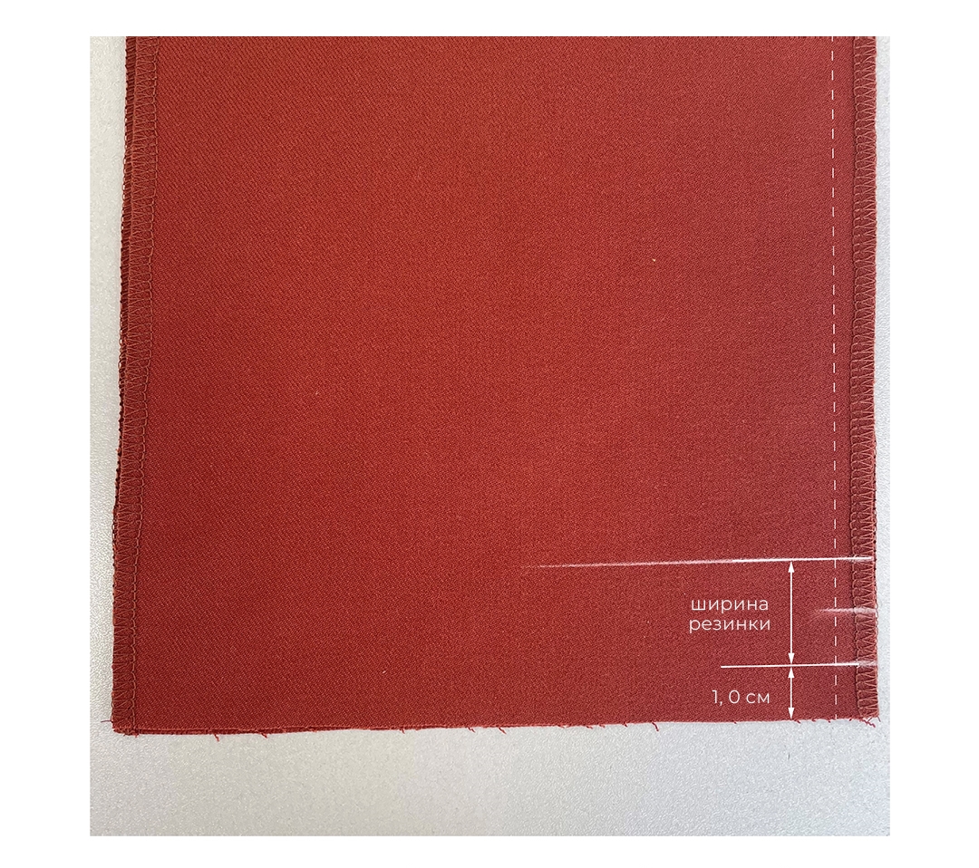 - Концы эластичной тесьмы наложите друг на друга на 1 см, настрочите два раза строчка в строчку или строчкой зигзаг.