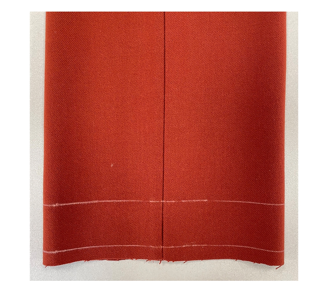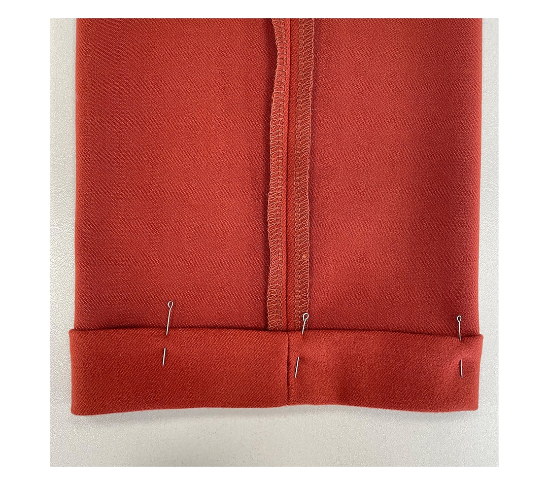 - С лицевой стороны наметьте линию низа брюк и припуск на обработку 1 см от нижнего среза.