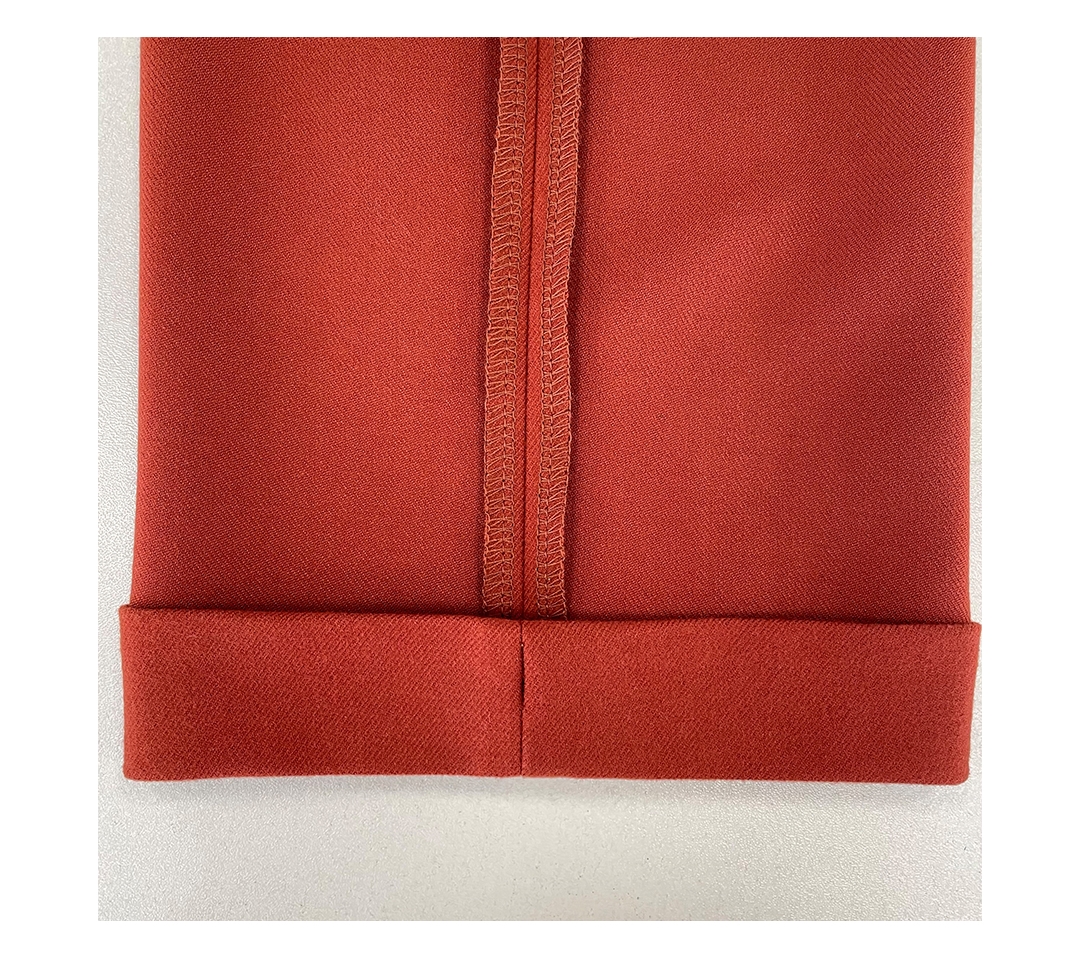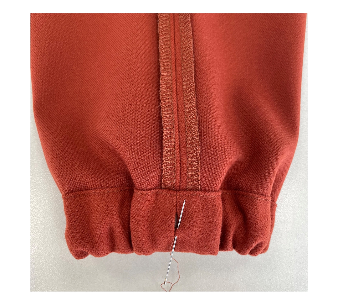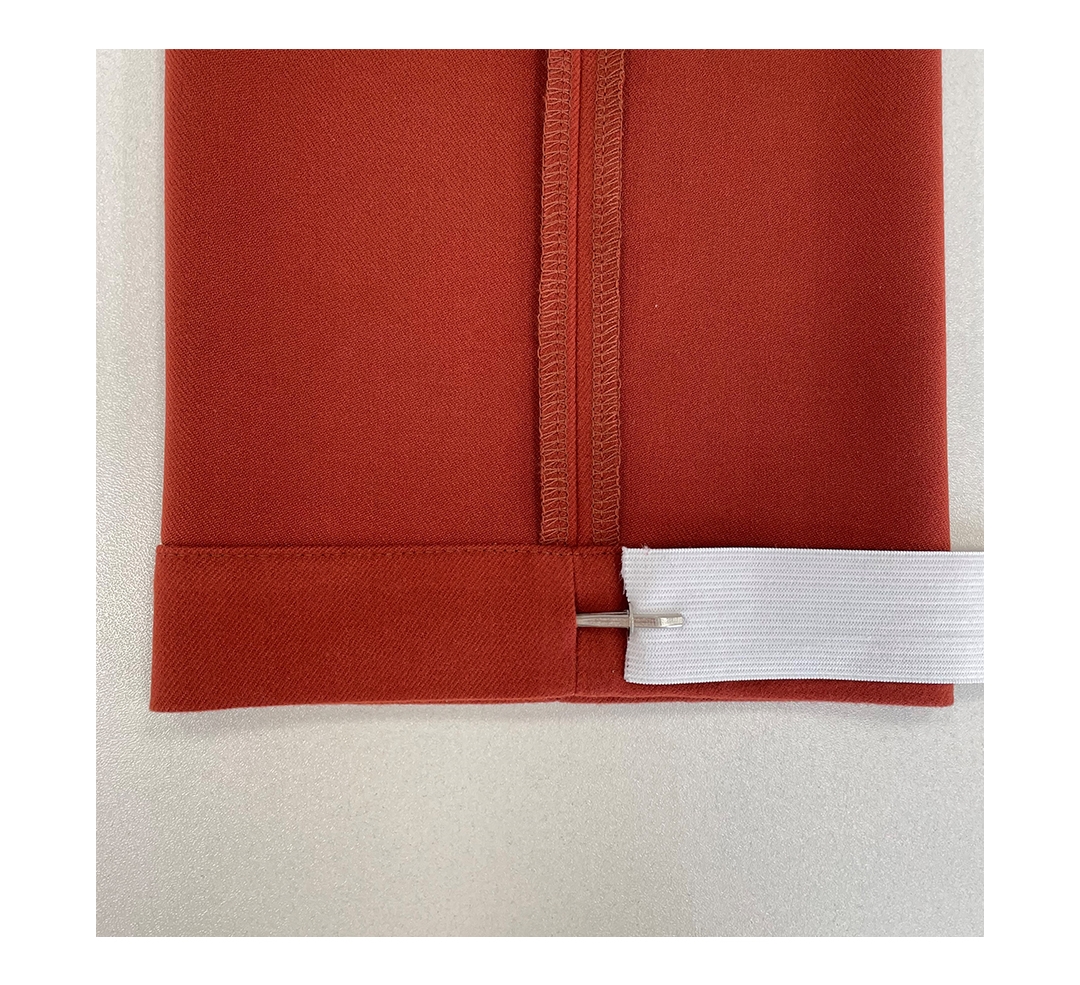 - Аккуратно заправьте эластичную тесьму внутрь припуска. Распределите ее равномерно по низу брюк и зашейте отверстие ручными стежками.