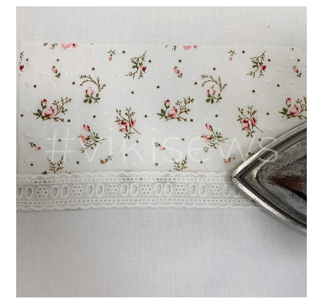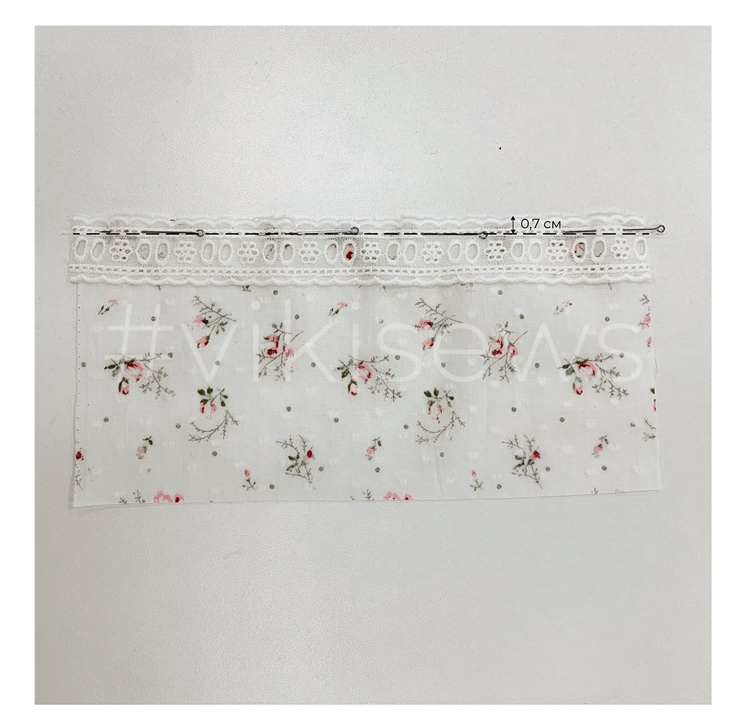 - Совместите один срез детали со срезом кружевной тесьмы изнаночными сторонами друг к другу. Сколите, стачайте на швейной машинке.