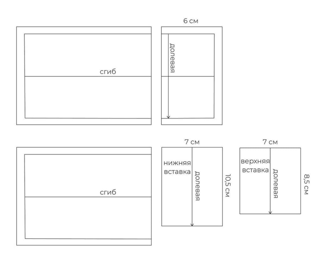 - нижняя вставка — ширина детали равна 7 см, длина — 10,5 см (с учетом припусков 1 см);