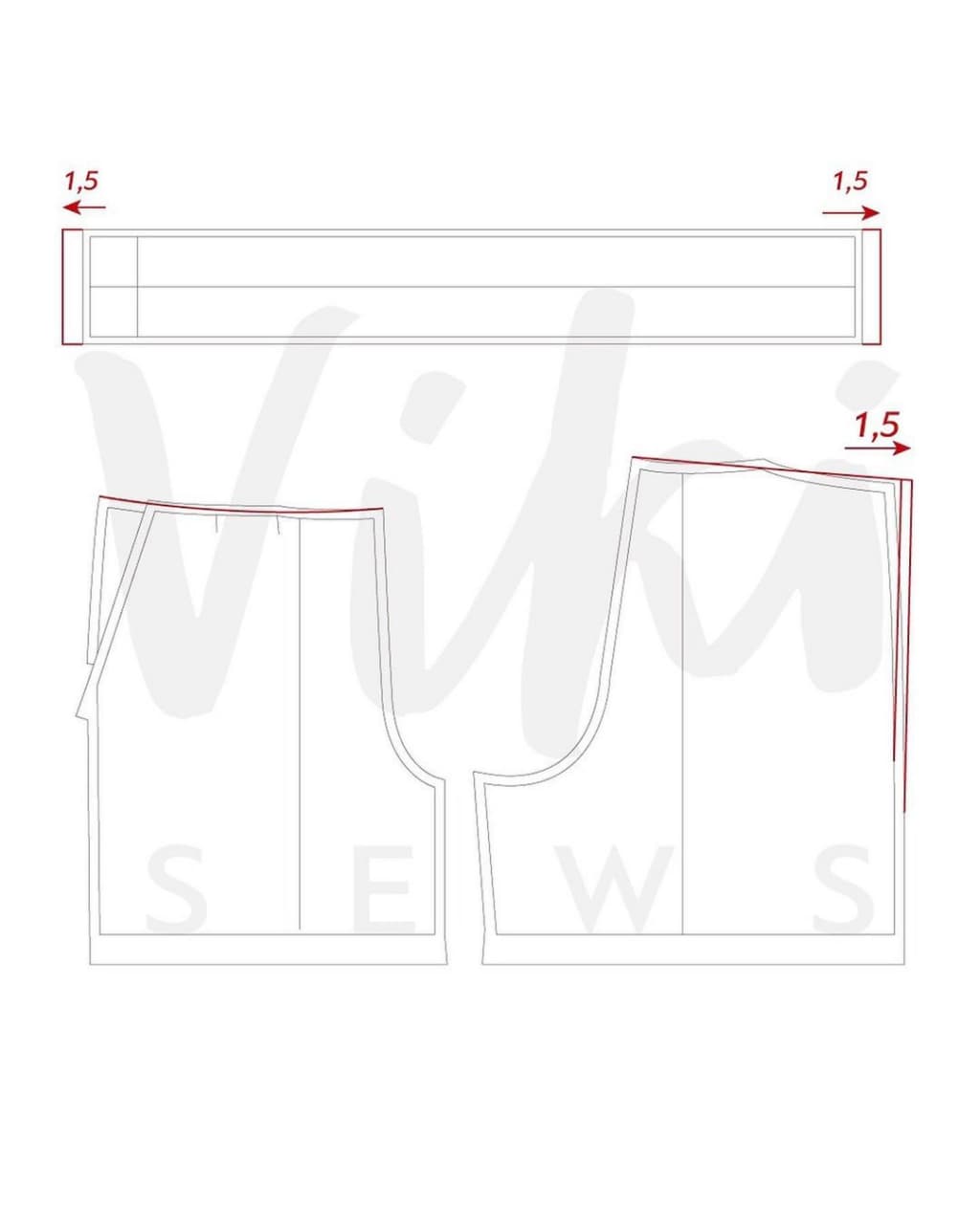 2. Высчитайте ширину и длину пояса. Для этого расширьте по боковому шву вверху заднюю половинку шорт на 1,5 см. На эту же величину увеличьте и длину пояса с обеих сторон (1,5+1,5 см). Проверьте, чтобы длина пояса равнялась длине верхнего среза шорт. Теперь рассчитайте ширину пояса: ширина резинки х 2 + 1 см на свободу облегания + 2 см на припуски. Например, при ширине резинки 3 см ширина детали составит 9 см.⠀