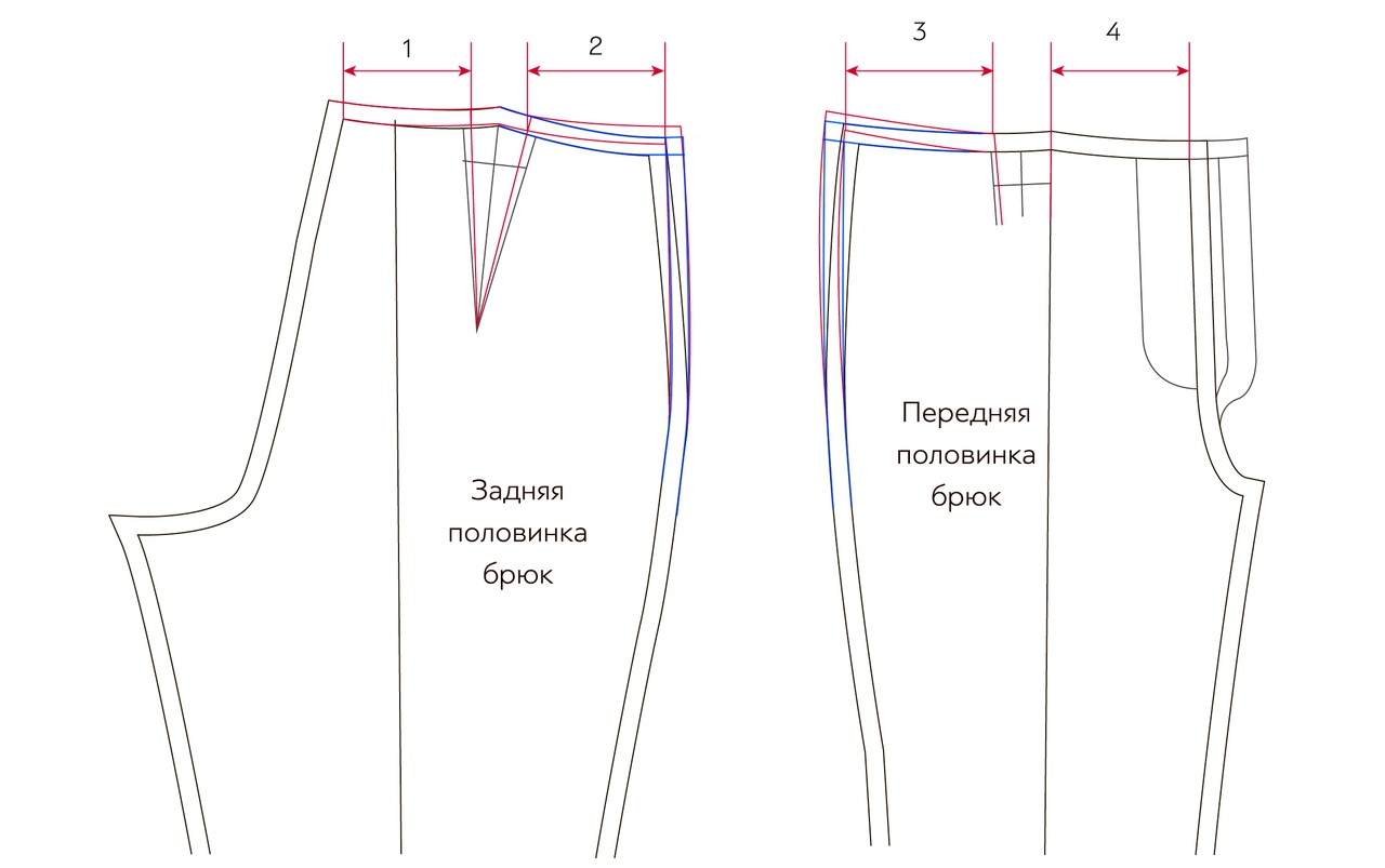 Внесите изменения в лекала пояса по инструкции из статьи «Коррекция выкройки брюк с защипами на узкую талию», только в этот раз увеличивая деталь согласно новой линии талии брюк. Схема корректировки есть выше.