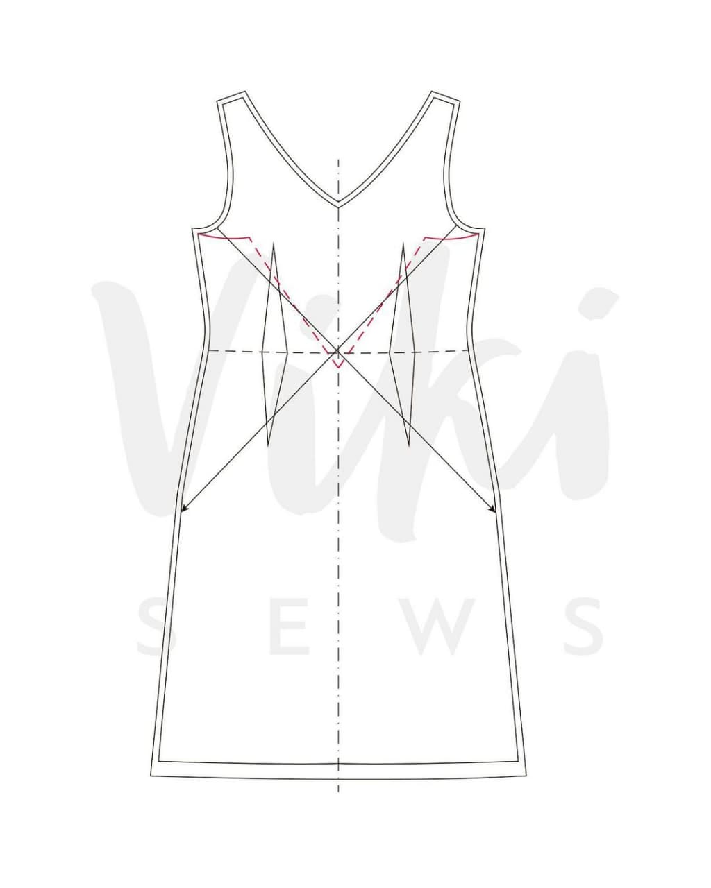 6. Наметить линию обтачки спинки, отступив от бокового шва столько же, сколько обтачка переда, и по центру примерно 7-10 см. Эти точки соединить плавными линиями.