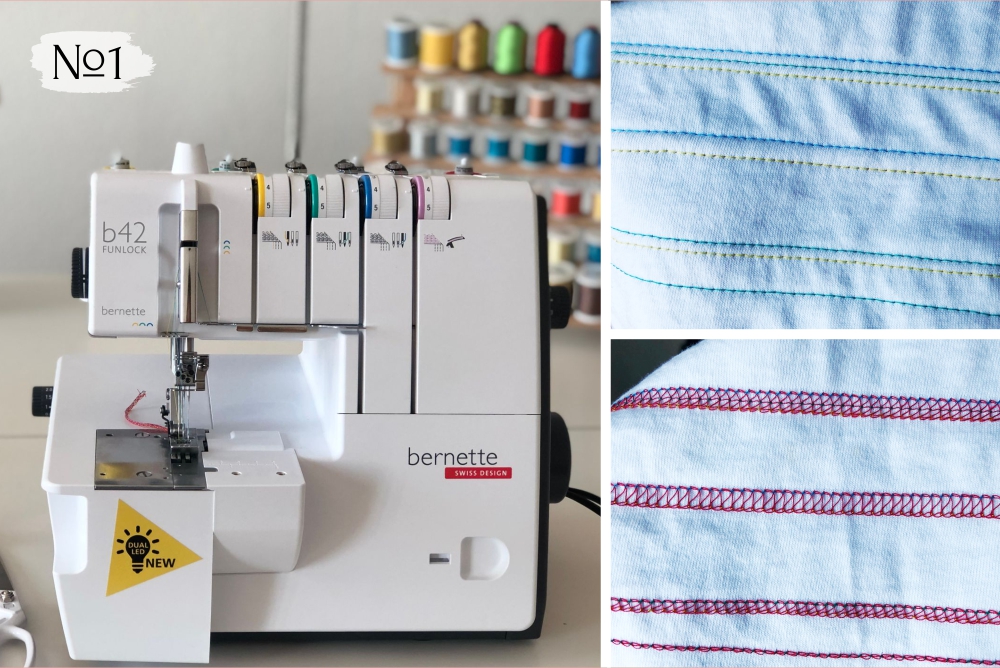 Эта машина во время тестов выполняла красивые швы сразу, «из коробки», не требуя тонкой настройки натяжения нитей. Как говорится, достал и шьешь. Ни один из материалов не стал для нее проблемой: кулирка, трехниточный футер в 4 слоя, бифлекс — все было прошито красивыми ровными строчками с аккуратной косичкой.