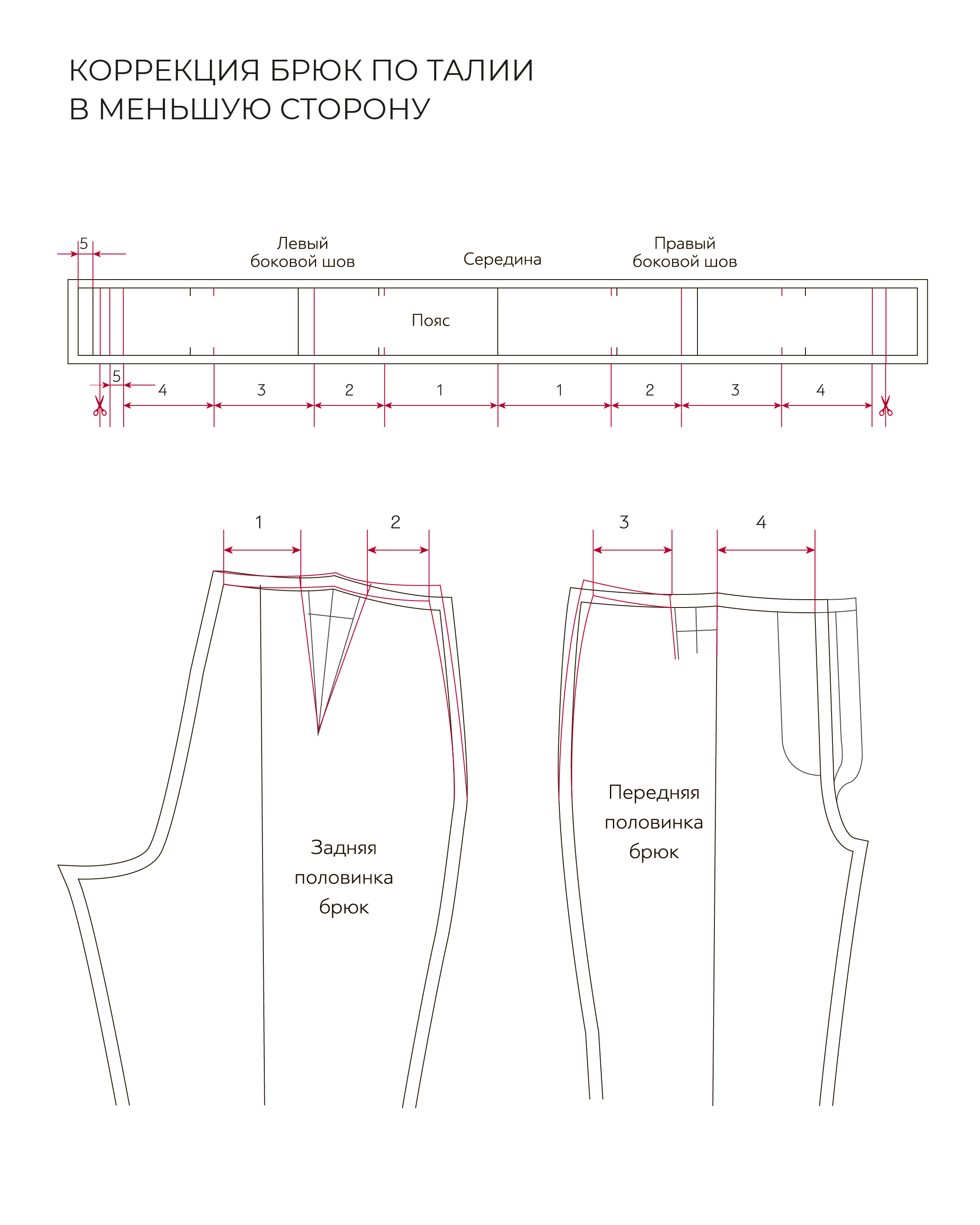 Корректировки нужно внести на 3,5 см за счет увеличения раствора вытачки по задней половинке брюк, защипа передней половинки брюк и по боковому шву.