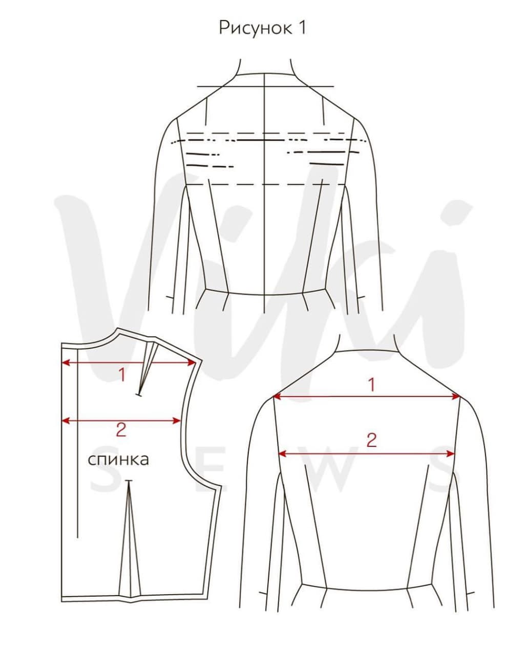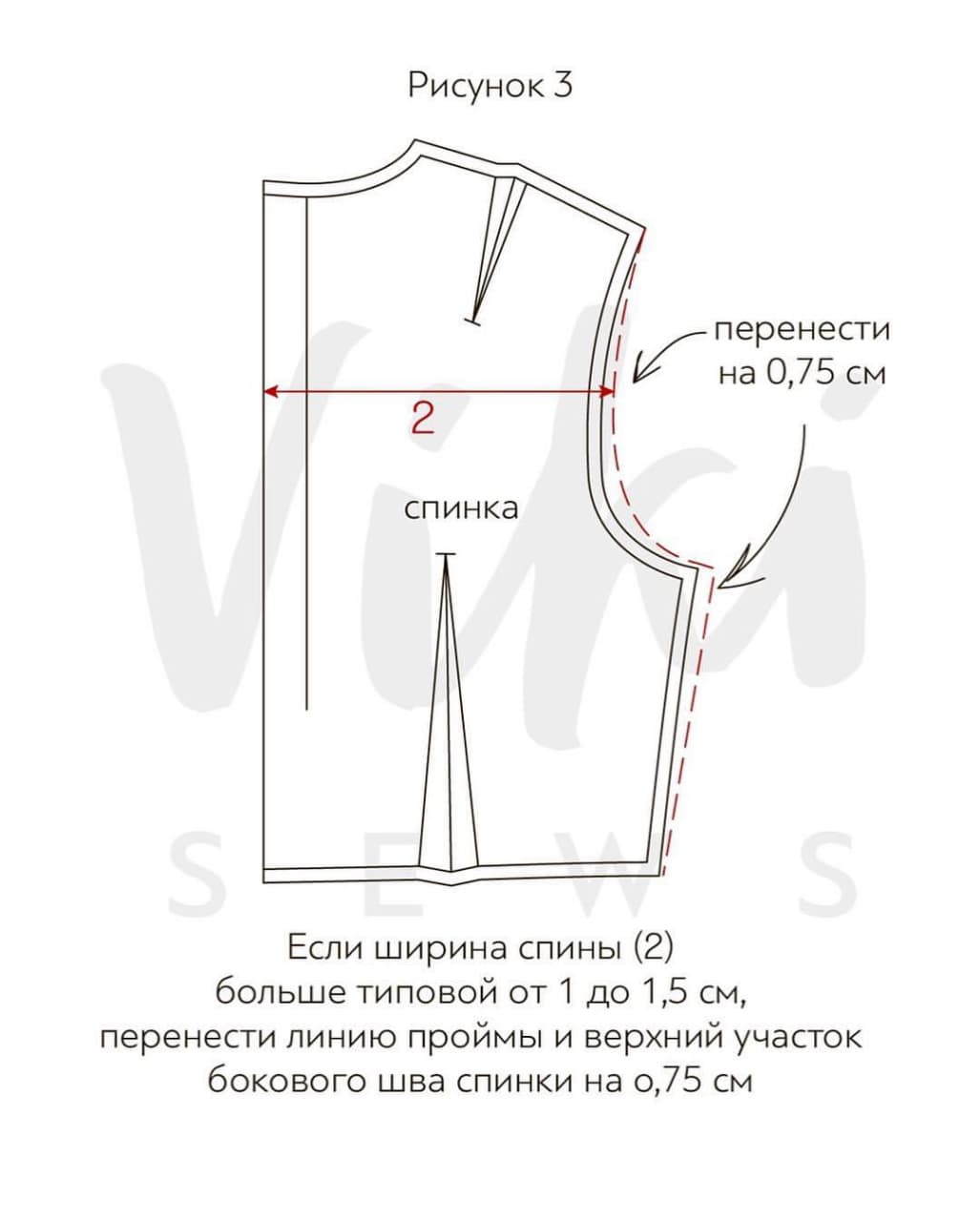Рисунок 3. Если ширина спины (2) больше, чем измерения типовой фигуры на 1-1,5 см, то линию проймы на уровне данного измерения и верхний участок бокового шва спинки нужно перенести на 0,5-0,75 см вправо в сторону расширения. Потом плавно свести к плечевому шву и линии талии лифа.