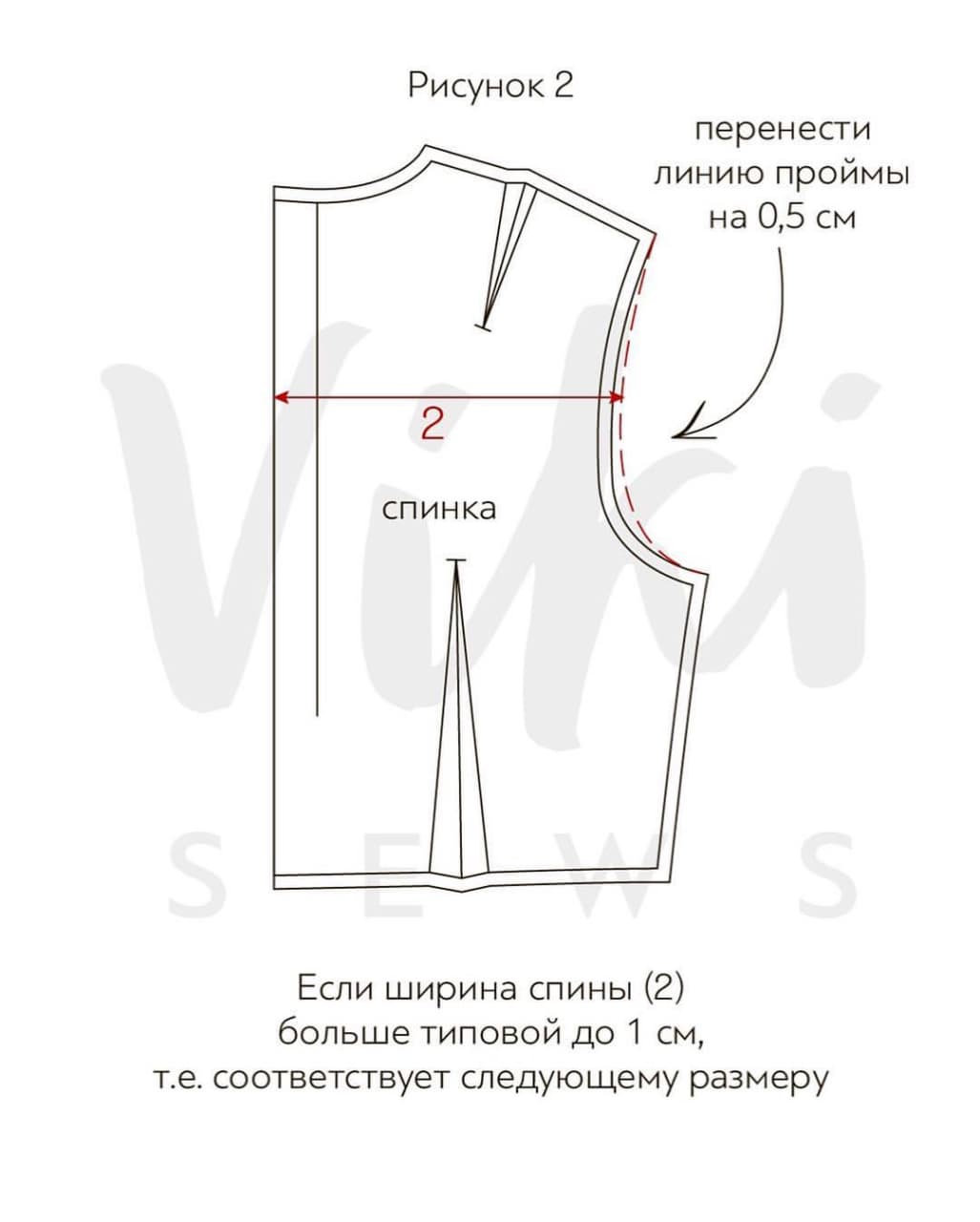 Рисунок 2. Если ширина спины (2) больше, чем измерения типовой фигуры до 1 см, то линию проймы на уровне данного измерения надо перенести на 0,5 см вправо в сторону расширения. Затем плавно свести линию к плечевому и боковому шву.