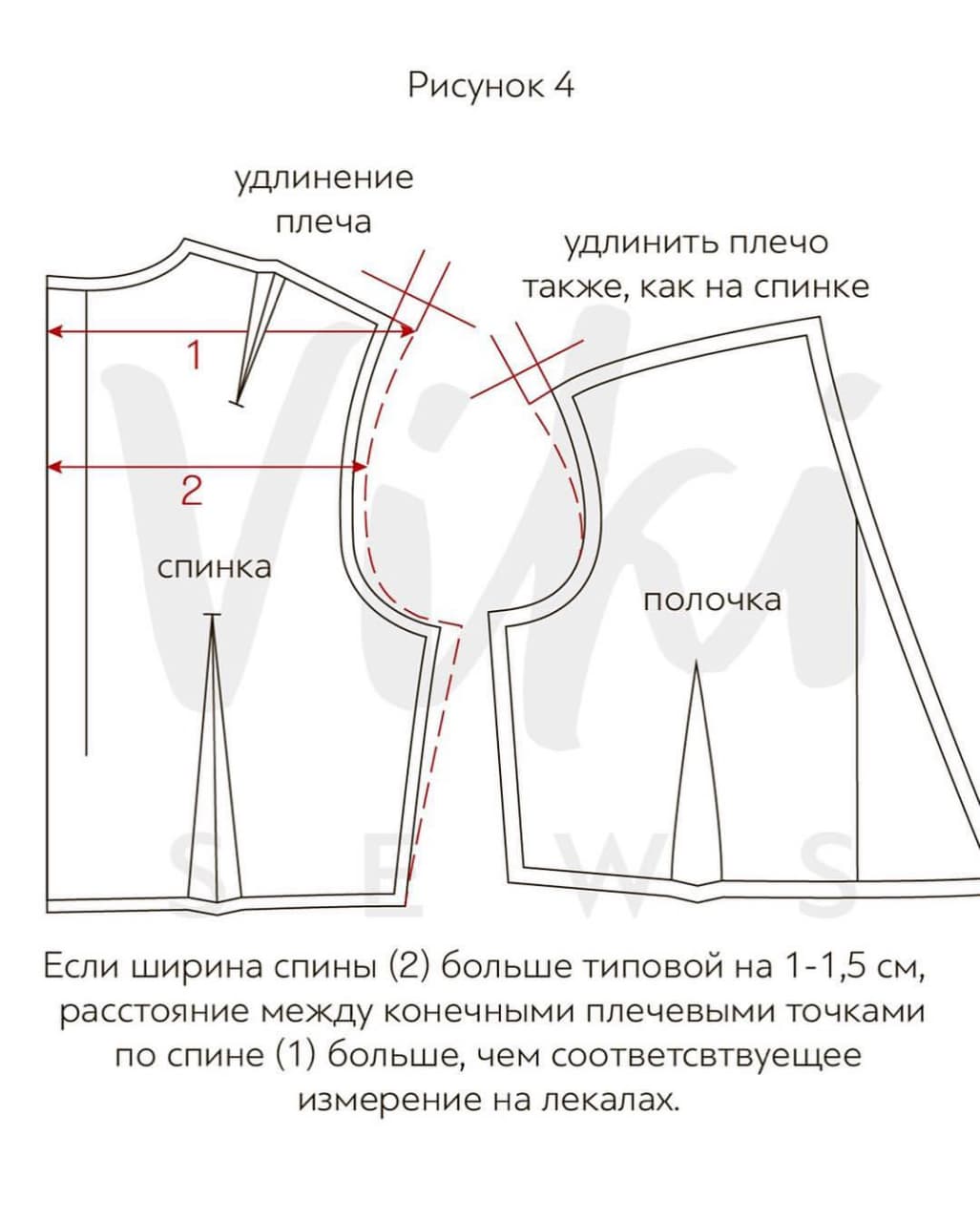 Рисунок 4. Если помимо увеличенной ширины спины (2) у фигуры еще наблюдается расширенный плечевой пояс, то необходимо расширить плечо на спинке и на полочке. Пройму и боковой шов оформить так же, как во втором варианте.