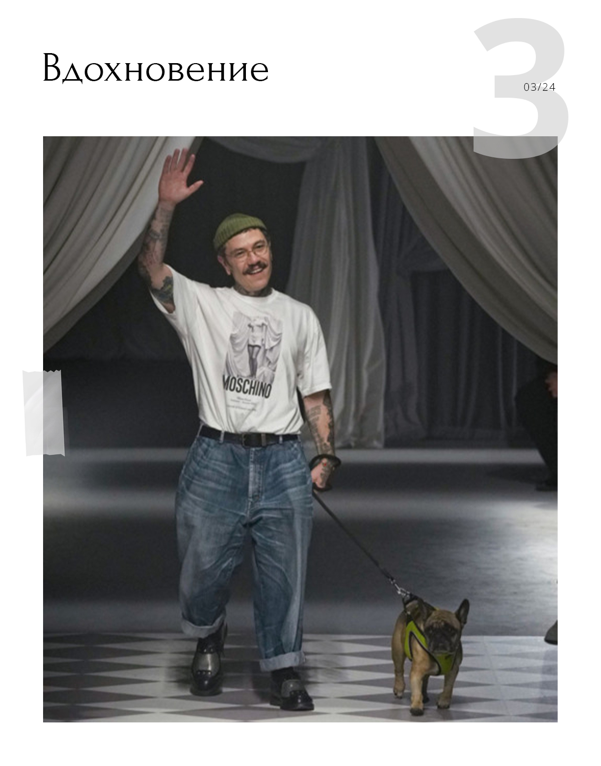 Свою энергию дизайнер черпает не только в истории моды. У него есть муза — французский бульдог Нена. На поклон в конце показа на Миланской неделе моды он вышел со своим любимцем.
