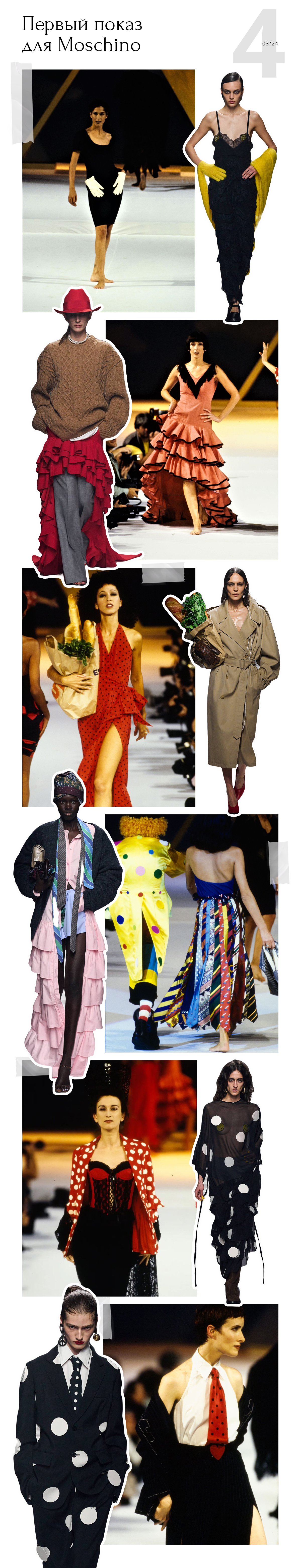 В коллекции можно увидеть тонкую ироничную насмешку над индустрией, которую так любил Франко Москино, и глубокую работу с архивами. Например, крафтовый продуктовый пакет с торчащими из него багетами и зеленью в первом выходе несла в руках и одна из моделей на показе Moschino Spring 1994. «Бумажные» шапочки — реверанс коллекции Cruise Me, Baby. В формах юбок были отсылки к фламенко, которое любил Москино, а нити жемчуга — ирония над Chanel, которую поддерживал основатель бренда.