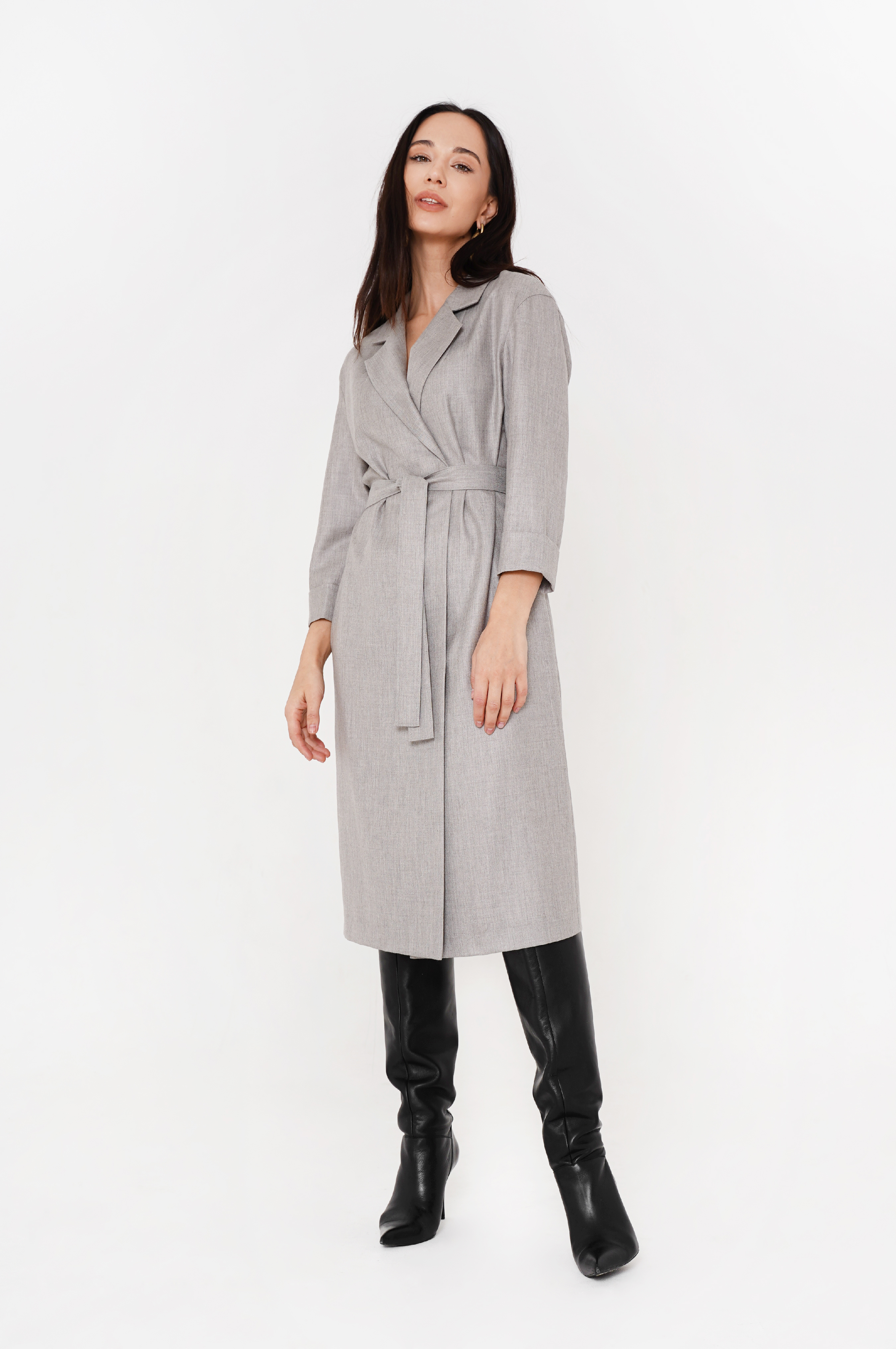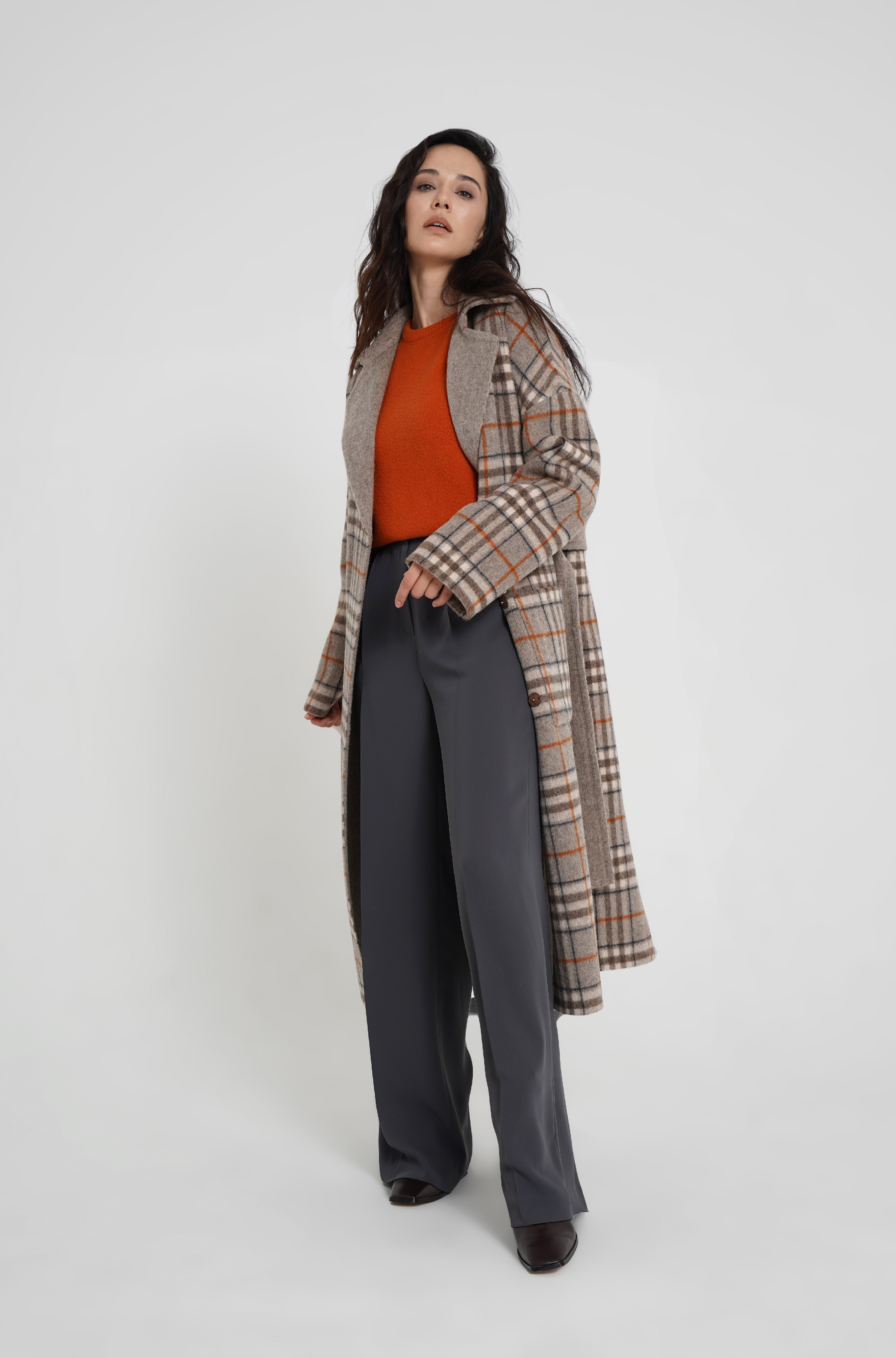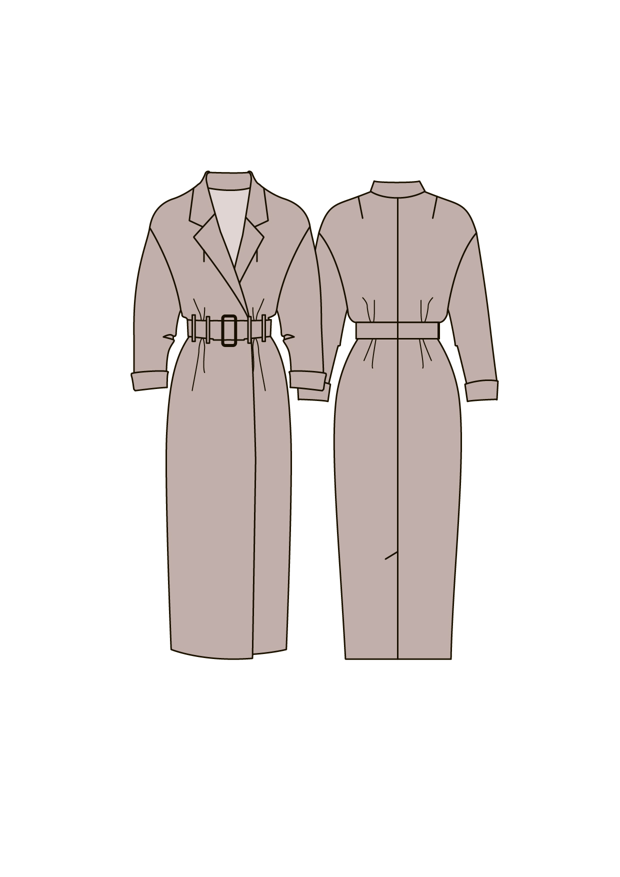 1. Пальто Триш- пальто прямого силуэта, объемное, двубортное, нагрудная вытачка спрятана под лацкан. По спинке кокетка, в среднем шве спинки шлица. Приспущенное плечо, рубашечный рукав. Воротник пиджачного типа с отрезной стойкой. Накладные карманы. Пальто выполнено из двухсторонней ткани без подкладки. Подкладка вставлена в рукава для удобства носки. Съемный пояс, в боковых швах шлевки.