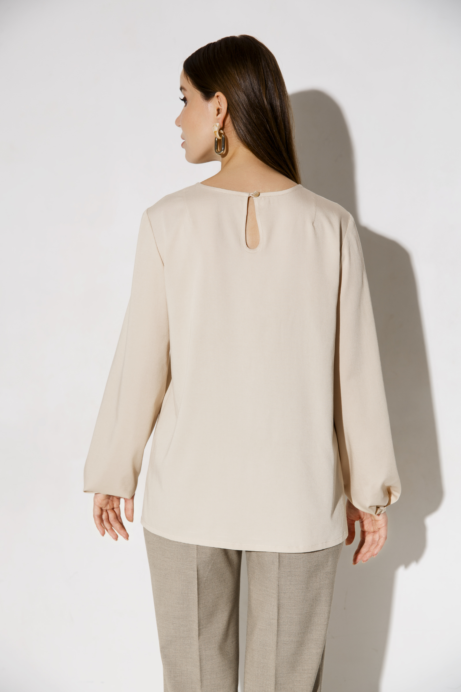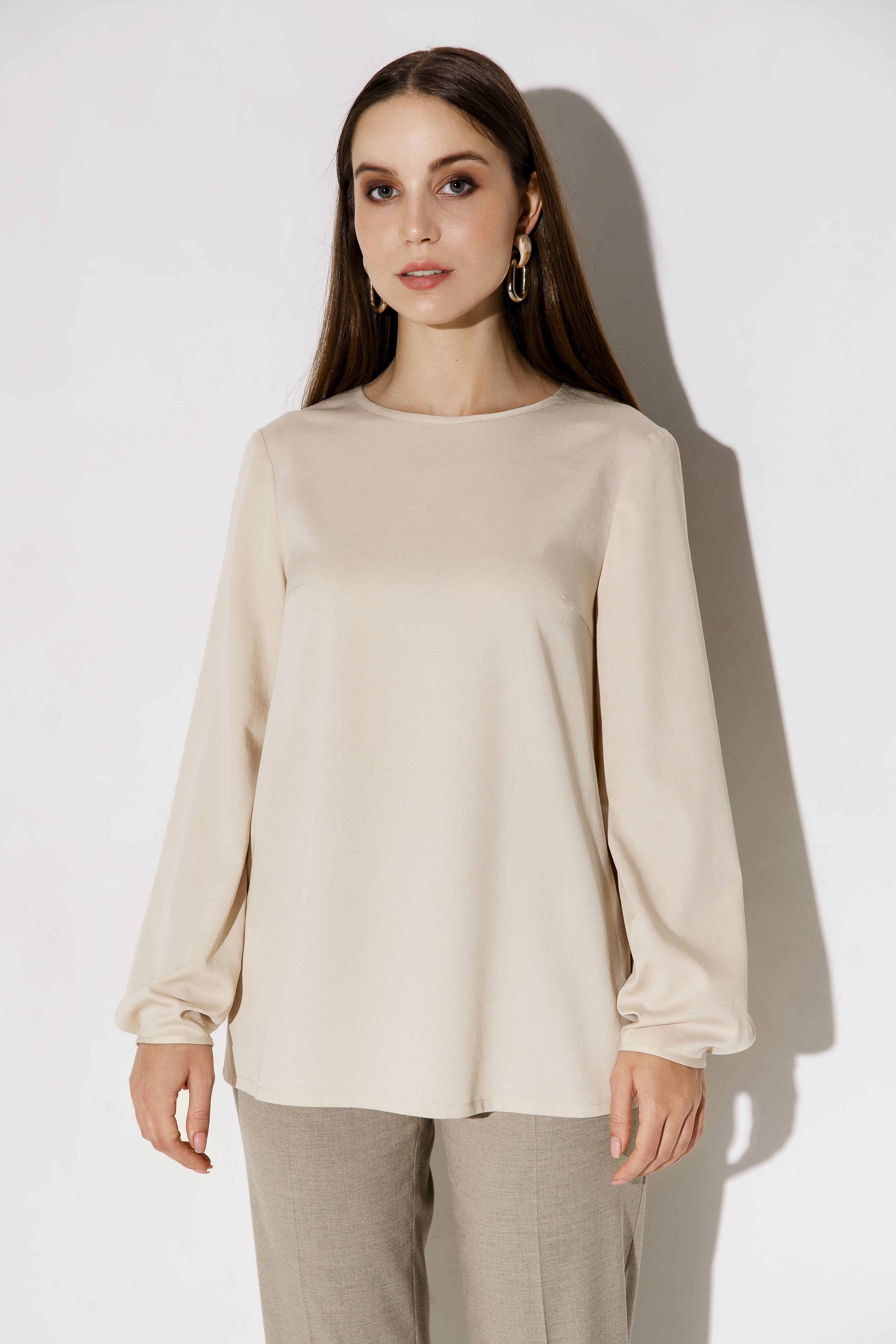 2. Блуза Дэя- блуза А-силуэта, с нагрудными и плечевыми вытачками. Втачной рукав, чуть расширенное плечо. По низу рукава заложена встречная складка. Горловина полукруглой формы. На спинке застежка-капля, обработанная руликом. Низ рукава и горловина обработаны руликом.