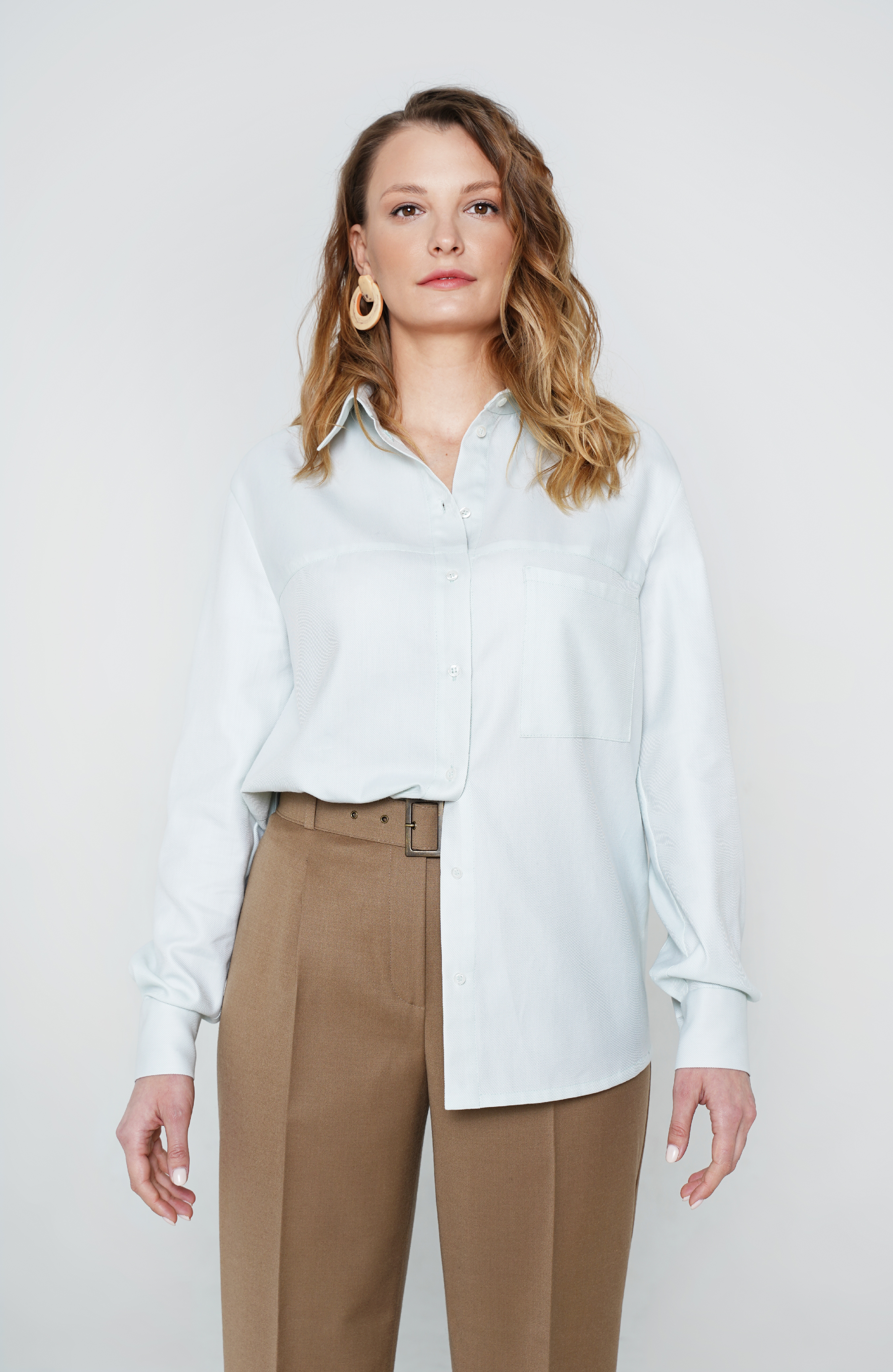 1. Блуза Стефани - блуза прямого силуэта, умеренного объема. Кокетка по спинке выше уровня лопаток, переходящая на полочку. В кокетку по полочке, которая располагается чуть выше уровня груди переведена нагрудная вытачка. Горловина оформлена отложным рубашечным воротником на стойке. По середине полочки - цельнокроеная планка. Застежка центральная, на обметанные петли и пуговицы. Линия плеча спущенная. Рукав длинный, рубашечный с притачной манжетой. Разрез на рукаве обработан планкой. На манжете 2 обметанные петли и пуговицы. На левой полочке накладной карман. Низ блузы фигурный, разноуровневый.