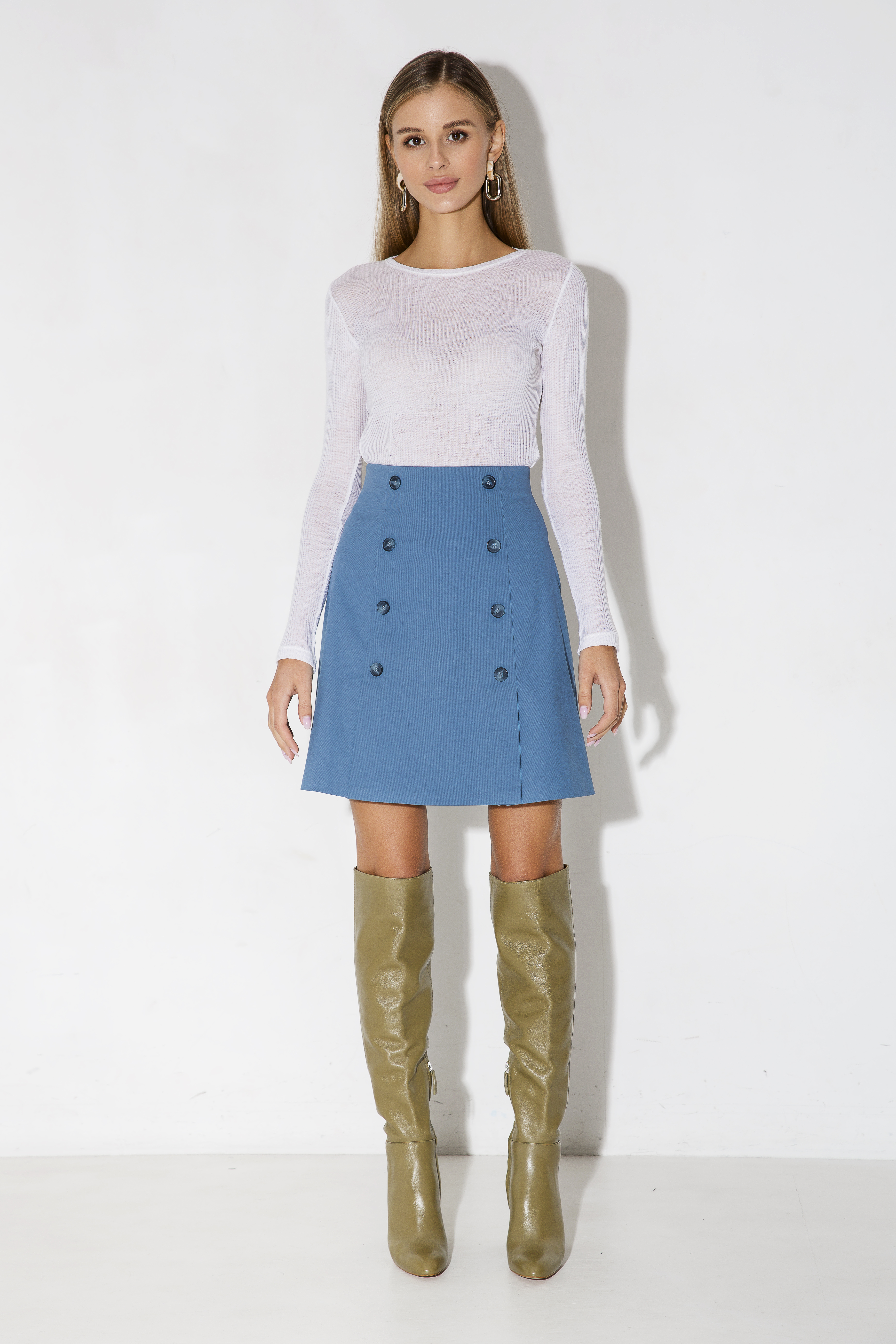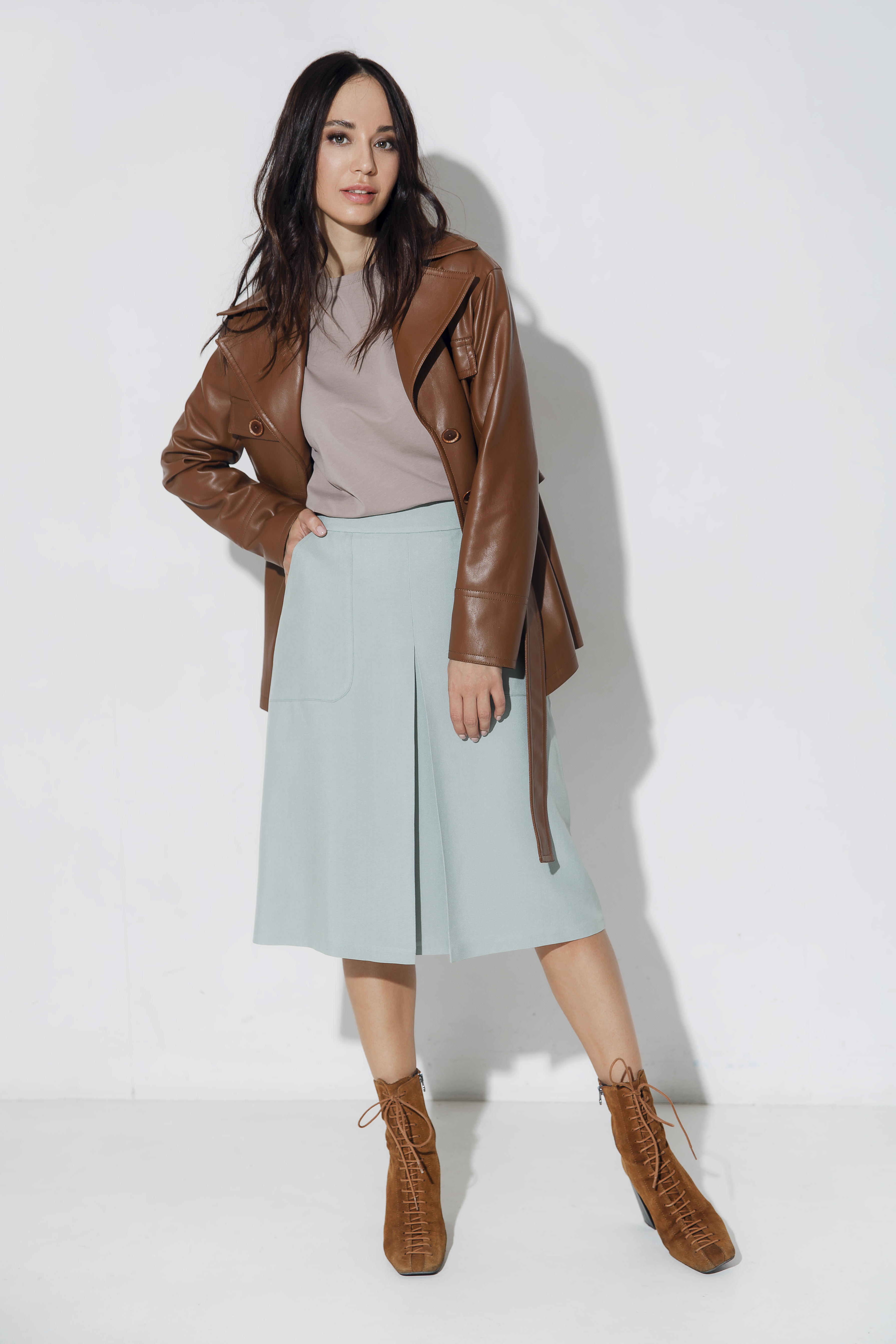 2. Юбка Элания- юбка трапециевидного силуэта, длиной ниже колена на отрезном поясе. В среднем шве переднего полотнища расположена встречная складка, застроченная сверху до линии бедер. В среднем шве заднего полотнища расположена застежка-молния. На передних полотнищах расположены накладные карманы, верхний срез которых входит в шов притачивания пояса, боковые стороны в боковые швы юбки.