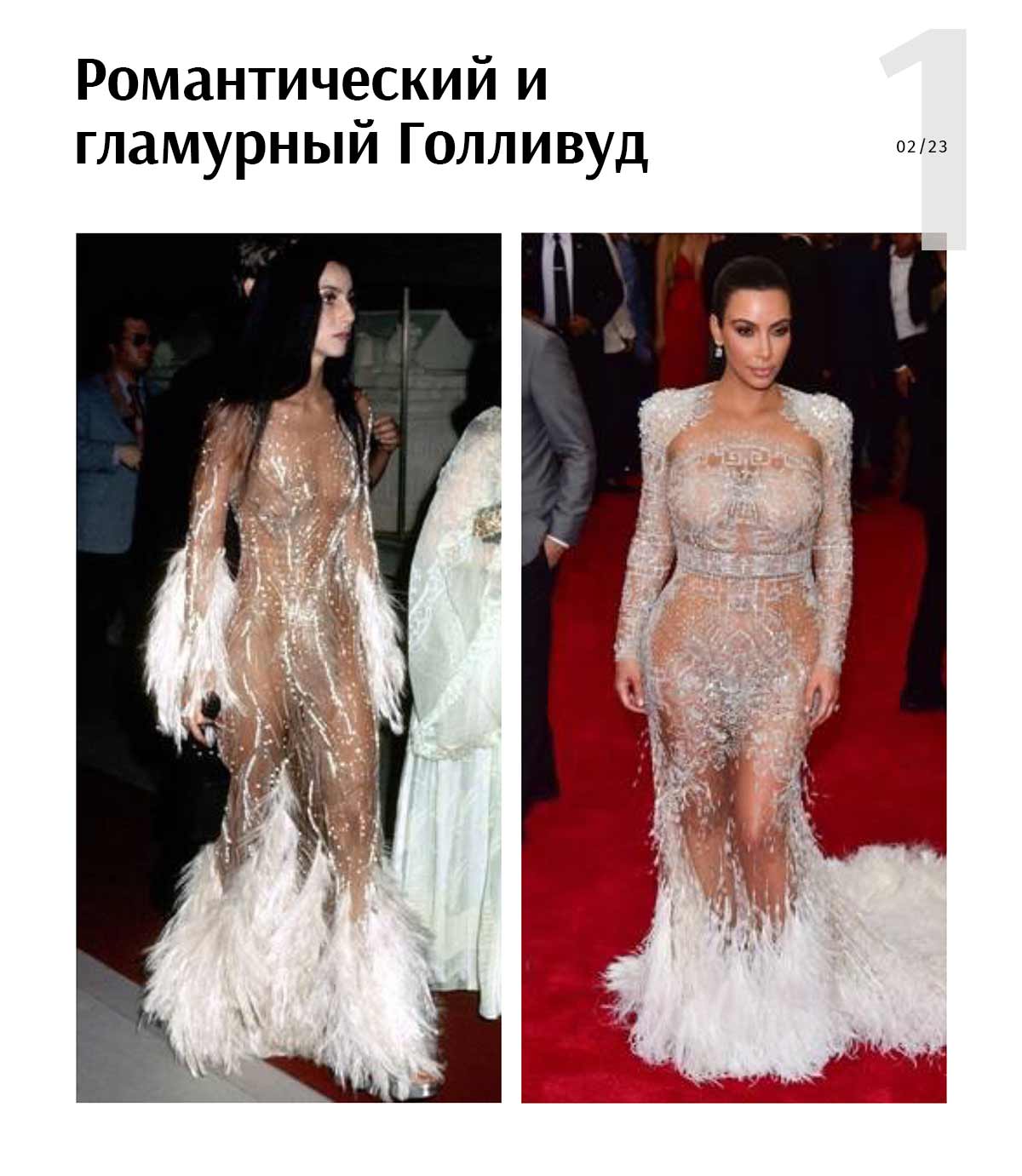 Первой темой бала стал «Романтический и гламурный Голливуд». Тогда же, в 1974-м, состоялся выход Шер в «голом платье» Боба Маки, который дал старт череде похожих образов на долгие годы вперед. В 2015-м Ким Кардашьян почти повторила лук Шер, когда вышла в Roberto Cavalli.
