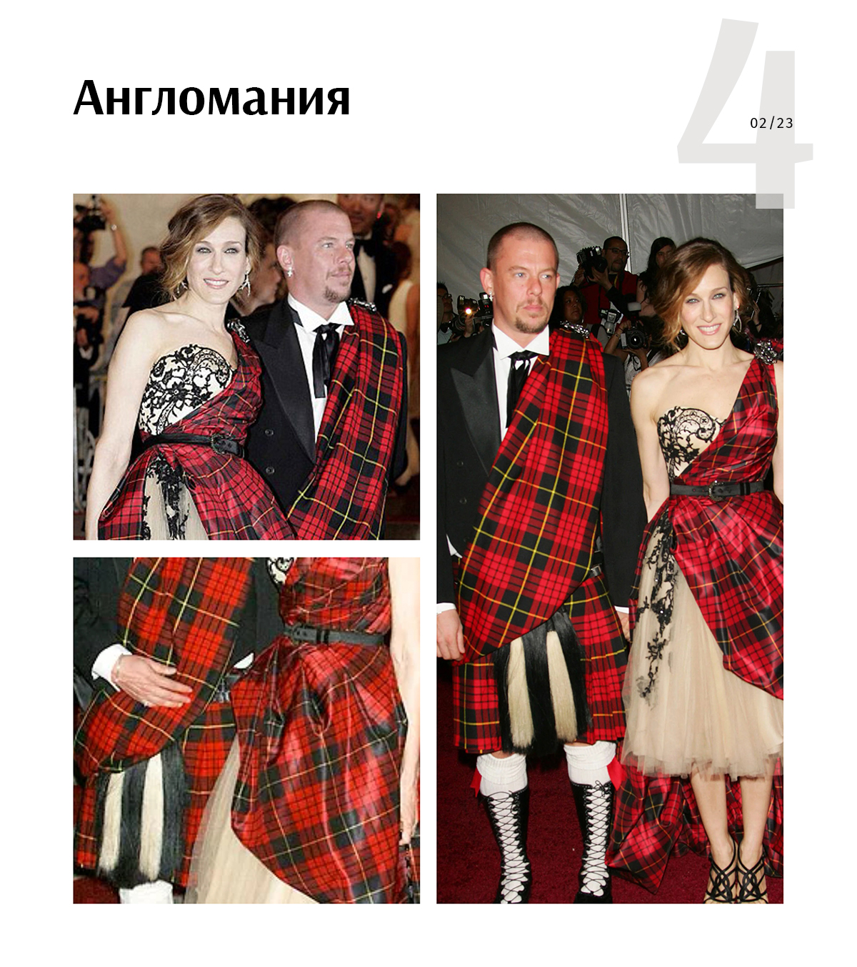 Для вечеринки с темой англомании лучшие образы продумал Александр Маккуин для себя и Сары Джессики Паркер. Это был самый яркий парный выход на Met Gala от гениального дизайнера. К сожалению, для Маккуина это был первый и последний визит на бал.