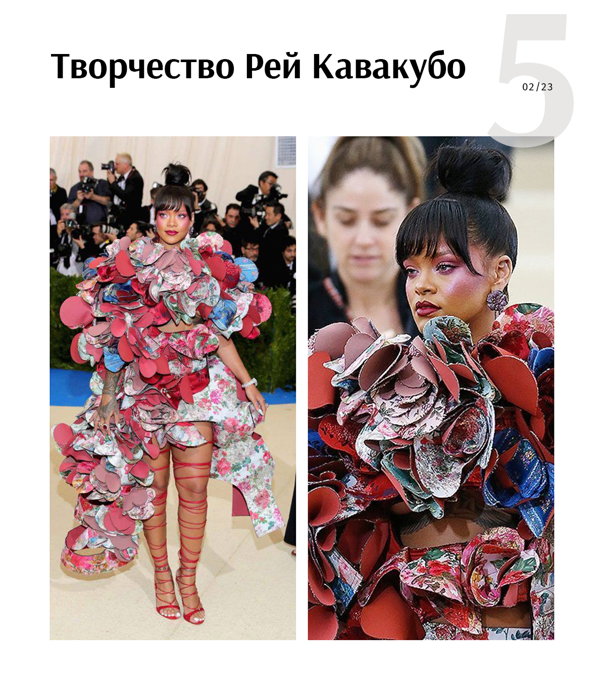 Сложно вспомнить, какой выход у Рианны на Met Gala был неудачным, но чтобы не делать каши, покажем один из самых не растиражированных, но интересных. В 2017 году певица максимально точно попала в дресс-код бала, который посвятили творчеству Рей Кавакубо. Говорят, Рианне понадобился час, только чтобы надеть босоножки.