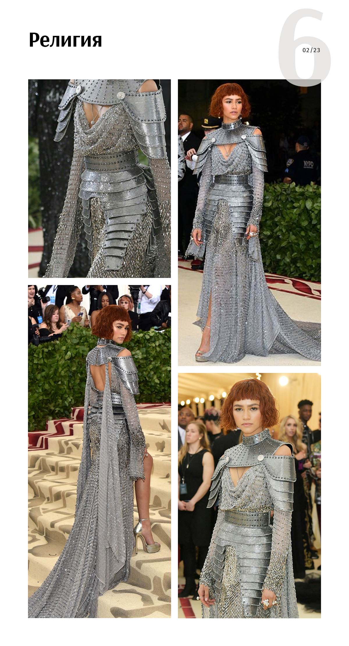 В 2018-м бал посвятили религиозной тематике. Среди множества мадонн и монахинь выделялась Зендая в образе Жанны д’Арк от Atelier Versace.
