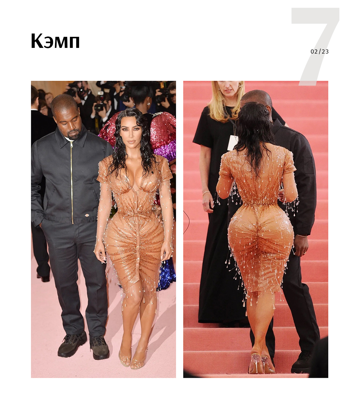 Пожалуй, выход Ким Кардашьян на балу в 2019-м помнят даже те, кто никогда не следил за модными событиями. Мокрое платье от Thierry Mugler сразу же пополнило списки лучших образов Met Gala. Только у него есть один секрет — в нем невозможно сидеть. Так что весь вечер Ким была вынуждена стоять и «терпеть», ведь не отлучиться даже в туалет.