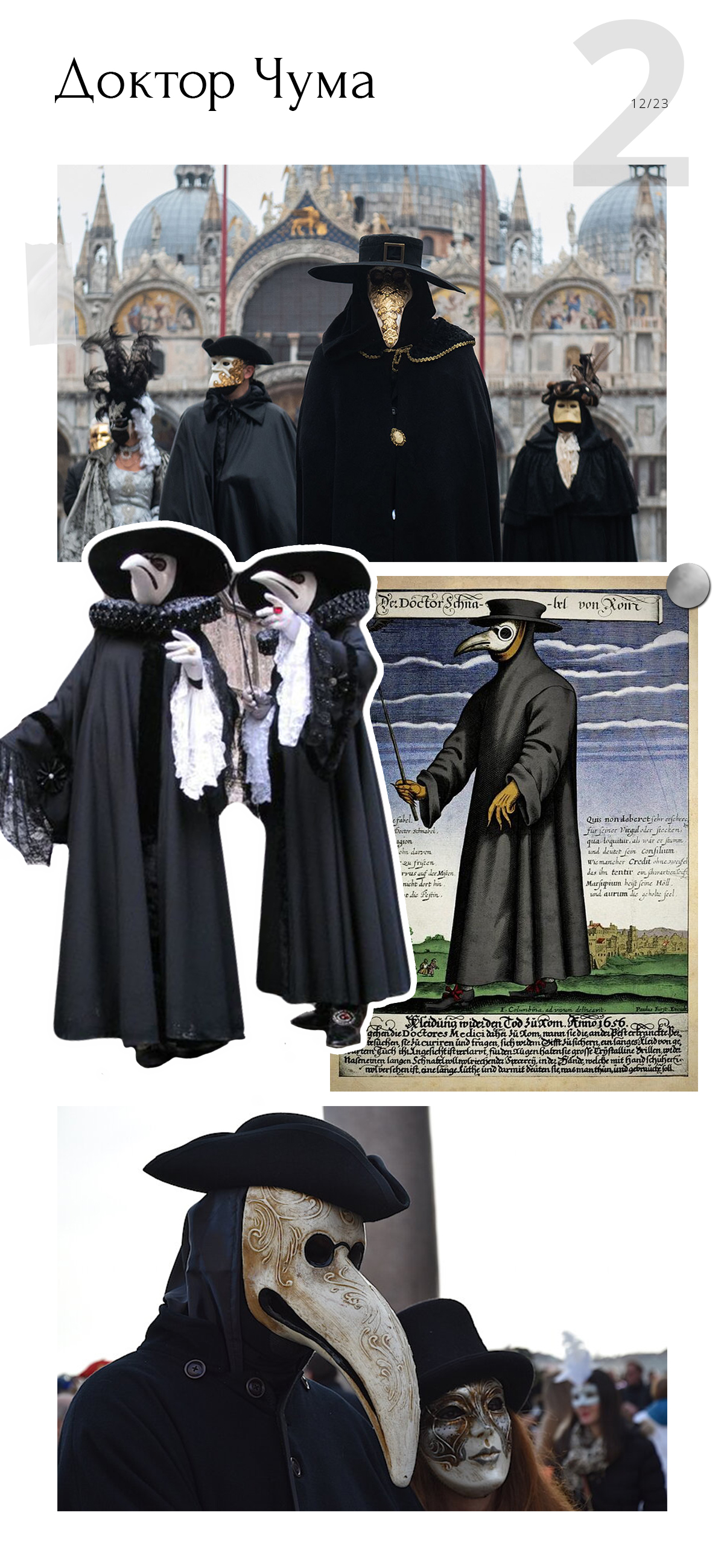 Самая узнаваемая маска Венецианского карнавала — Доктор Чума. Такие маски действительно носили врачи, которые посещали больных чумой. Считается, что костюм придумал француз Шарль де Лорм. Кожаная одежда должна была защитить лекаря от зараженных чумой, а маска в виде птичьего клюва нужна была для того, чтобы вложить в полость пучок лекарственных трав, которые очищали вдыхаемый воздух. В ноздри врач дополнительно вкладывал губки, пропитанные ладаном.